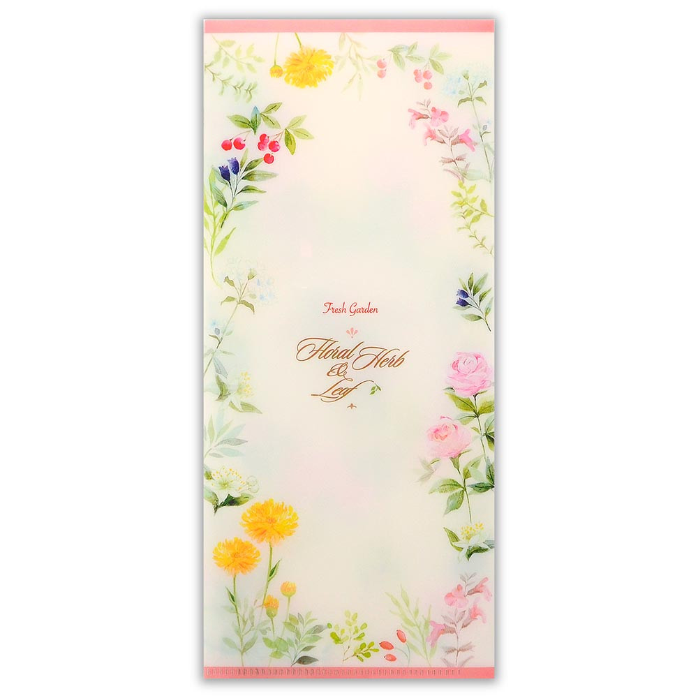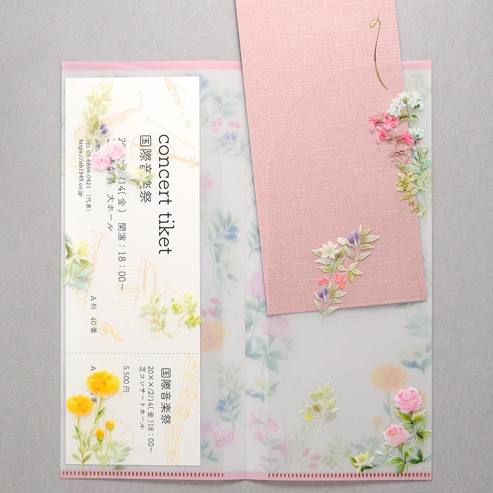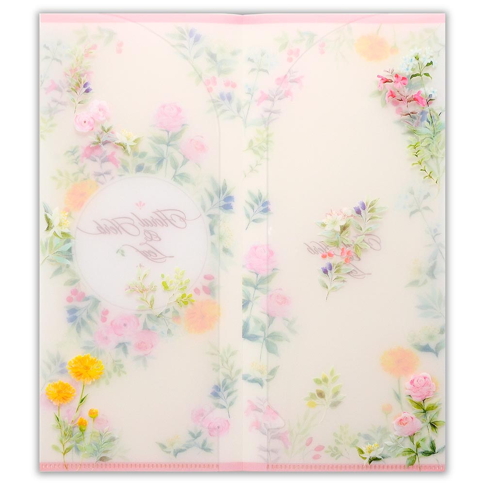ピンクや黄色のバラがメインの、花々の絵柄のチケットホルダーです。