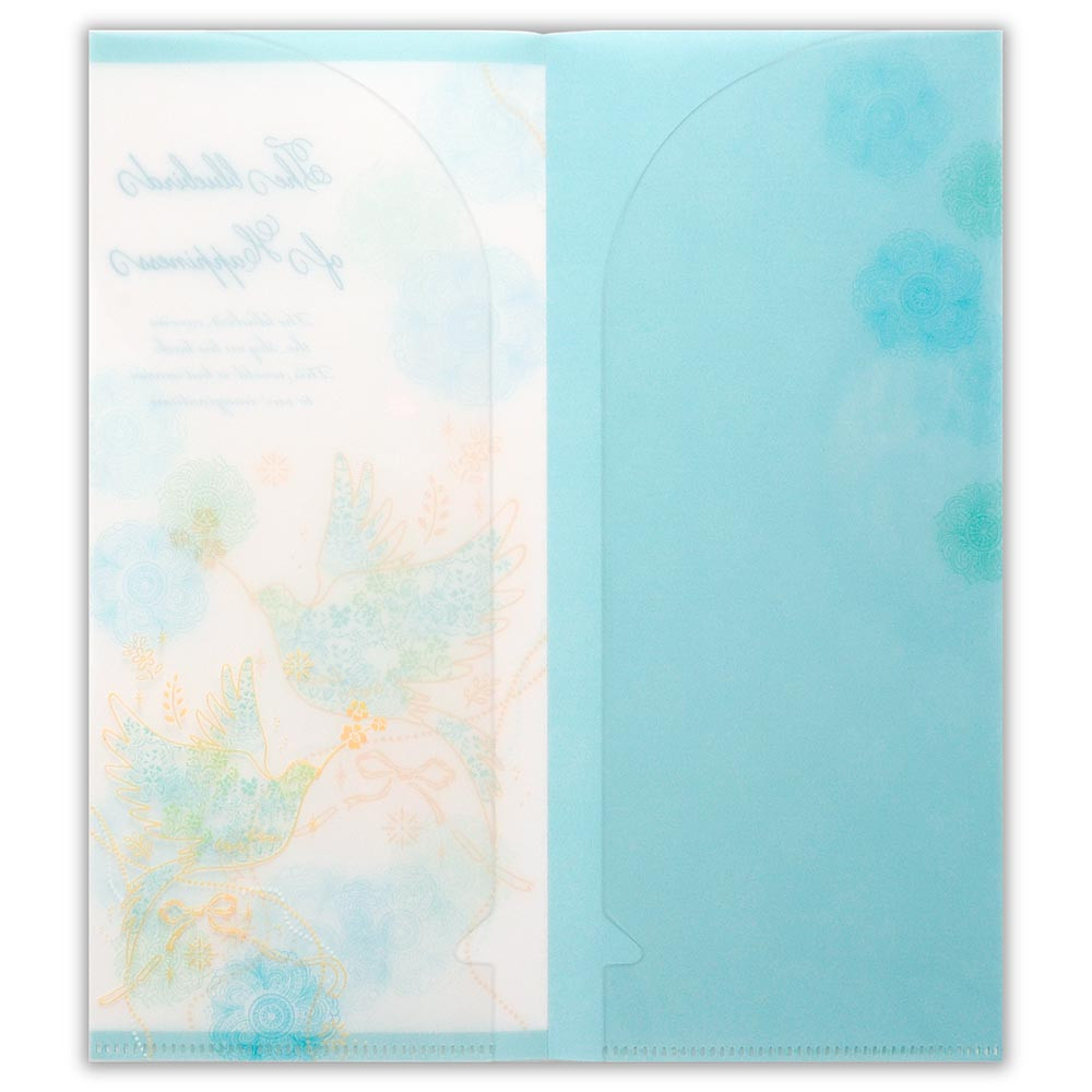 上品な羽ばたく鳥の絵柄のチケットホルダーです。 サブバッグやトートバッグにも入る二つ折りタイプです。 地色はブルーです。