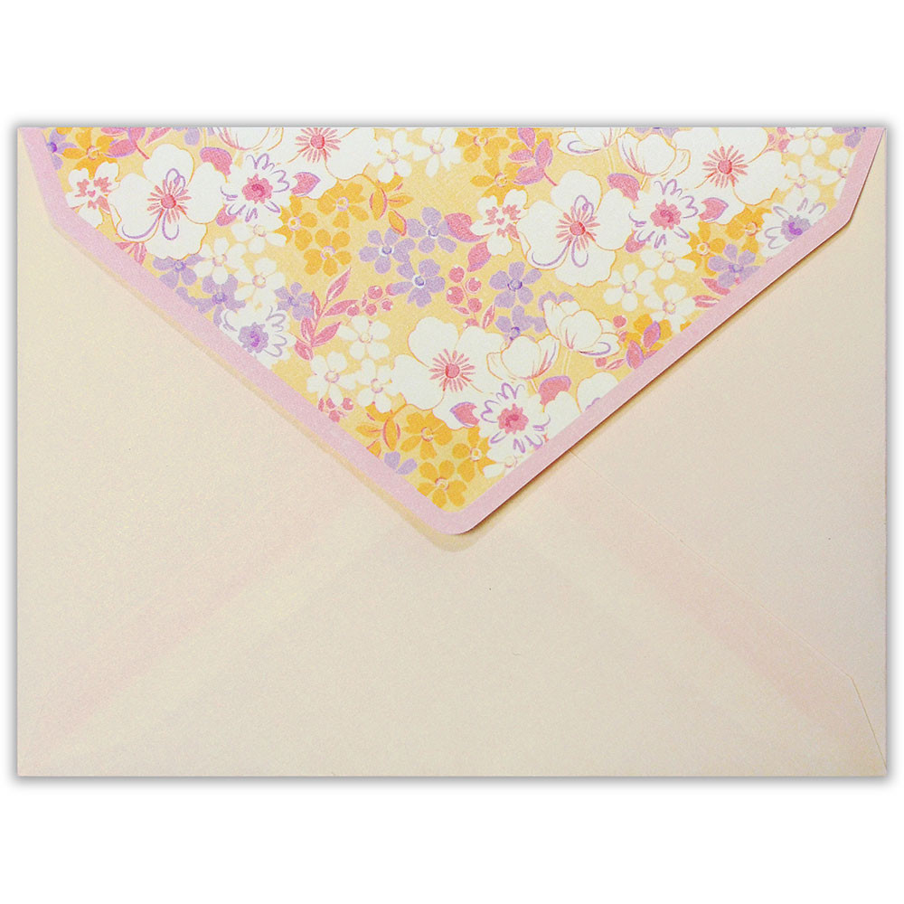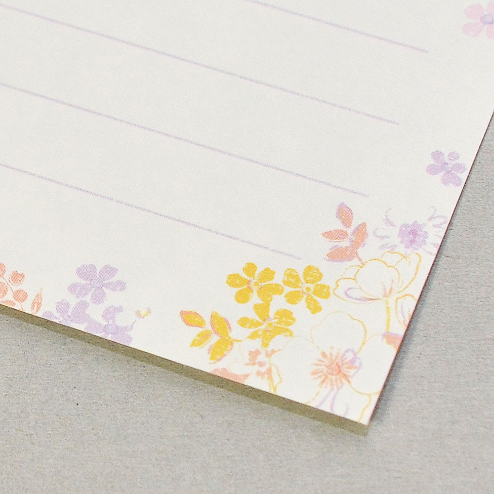 ベージュの色をベースに封筒はフラップ部分に便箋は周りに散りばめて、可愛いホワイトとパープルの花をあしらえたデザインです。