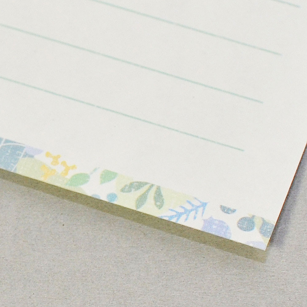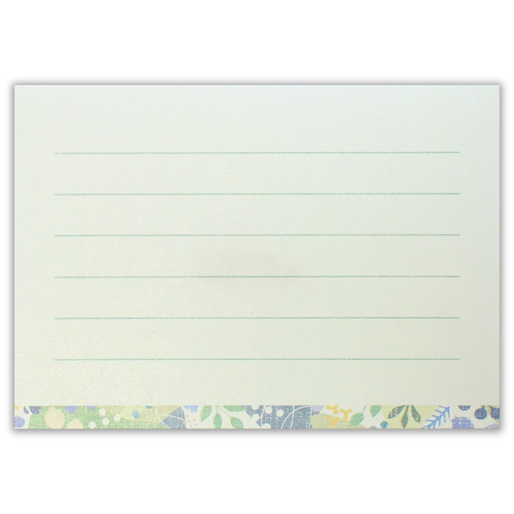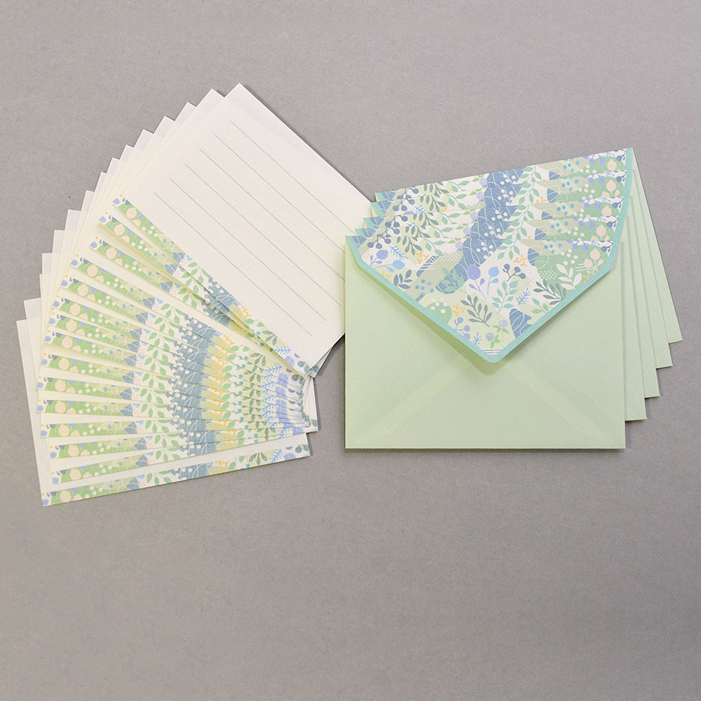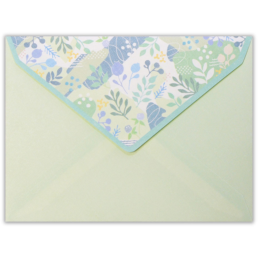 グリーンの色をベースに封筒はフラップ部分に便箋は下部分に、可愛いグリーンとブルーの葉と実をあしらったデザインです。