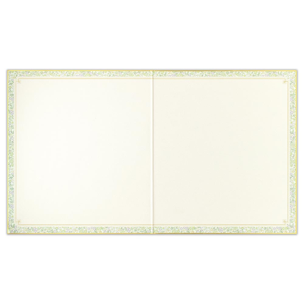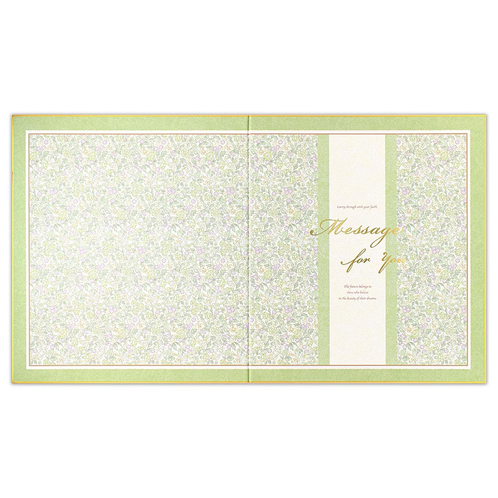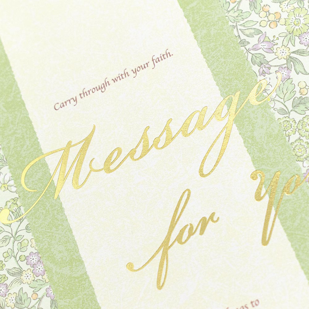グリーン系の花柄が上品なデザインの二つ折り色紙です。 淡い黄色や紫の花がアクセントとなり、爽やかな印象です。 表紙の箔押しがキラリと華やかに輝きます。