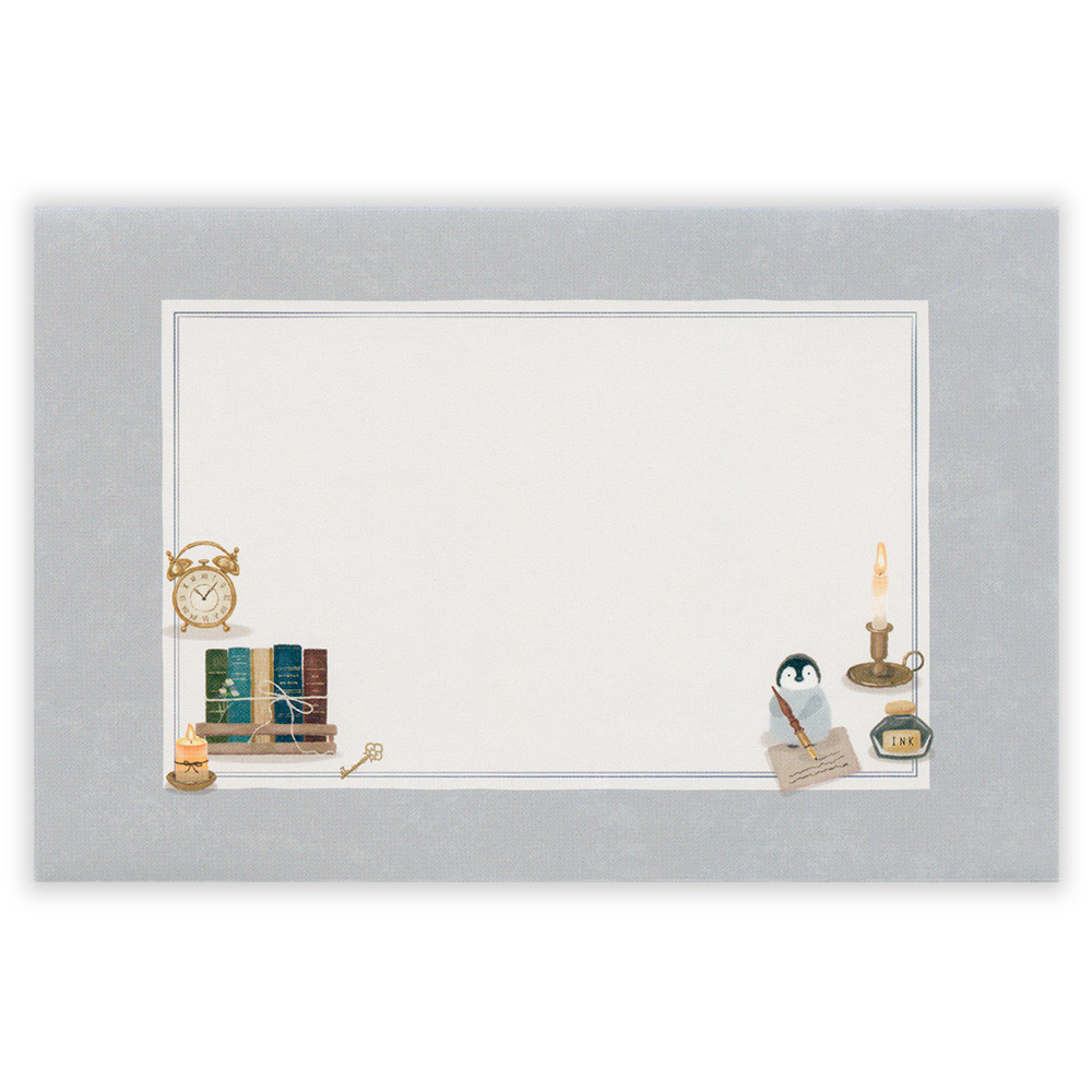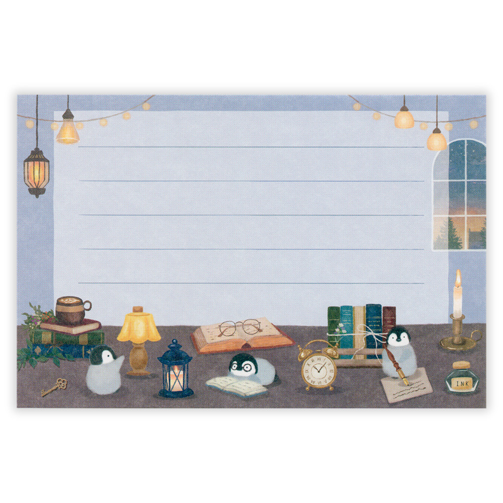 キャンドルやライトを灯して書斎で読書を楽しむペンギンを描きました。