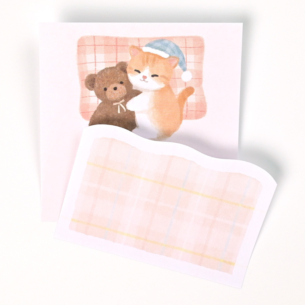 子猫が描かれた正方形のふせんにお布団柄のダイカットふせんを重ねることで、メッセージを隠すことができます。