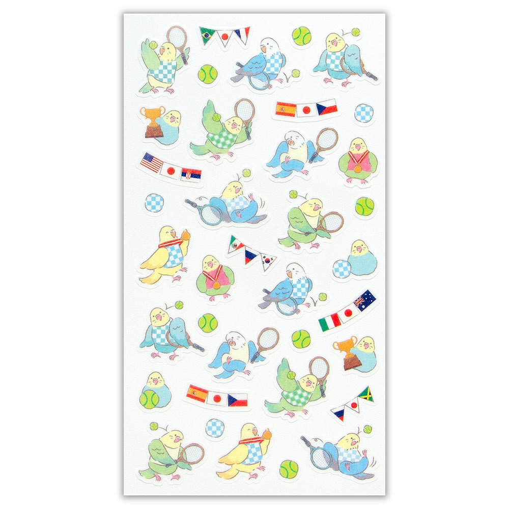 テニスを楽しむインコを描いたシールです。
