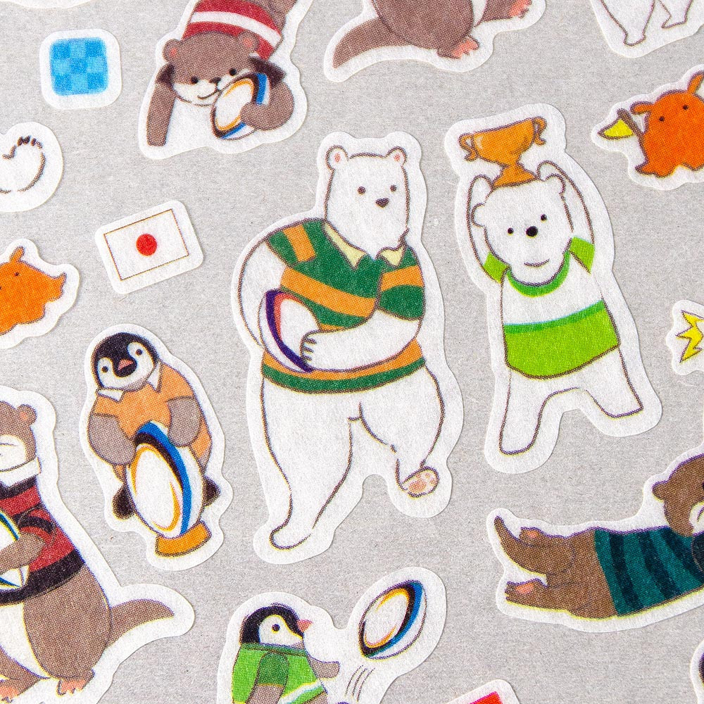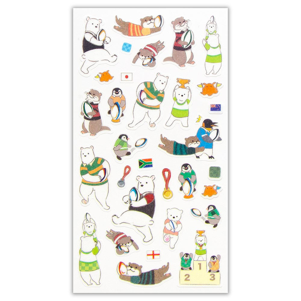 シロクマやカワウソ、ペンギンたちがラグビーをしている可愛らしいシールです。