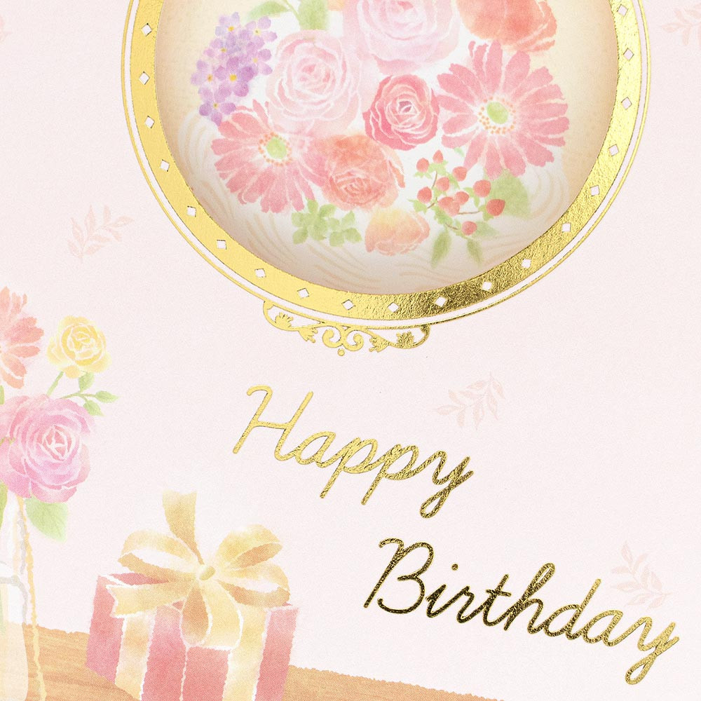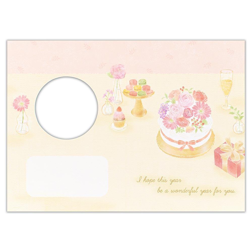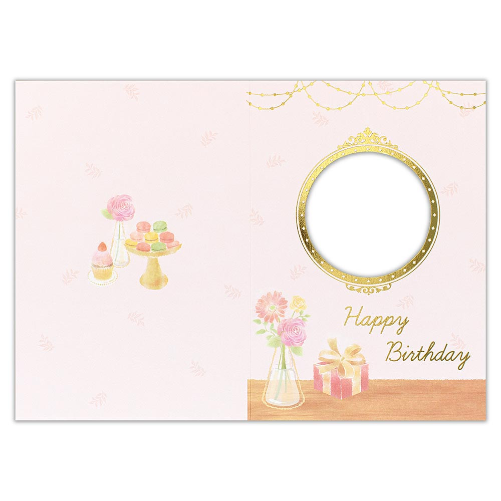 お部屋の壁に飾られた額縁の窓からは花束が覗き、中を開くとフラワーケーキなど華やかなパーティーの飾り付けが描かれています。