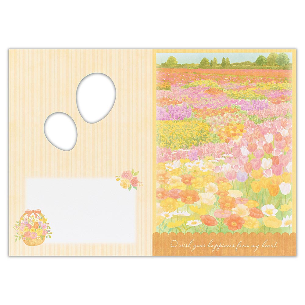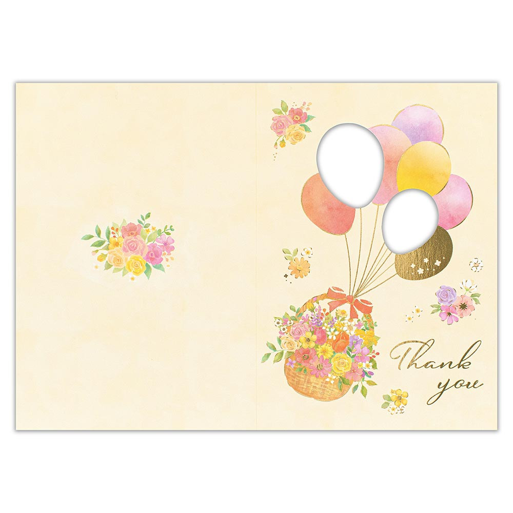 花かごを届ける風船の窓から花柄が覗き、中を開くと華やかな花畑が描かれたデザインです。