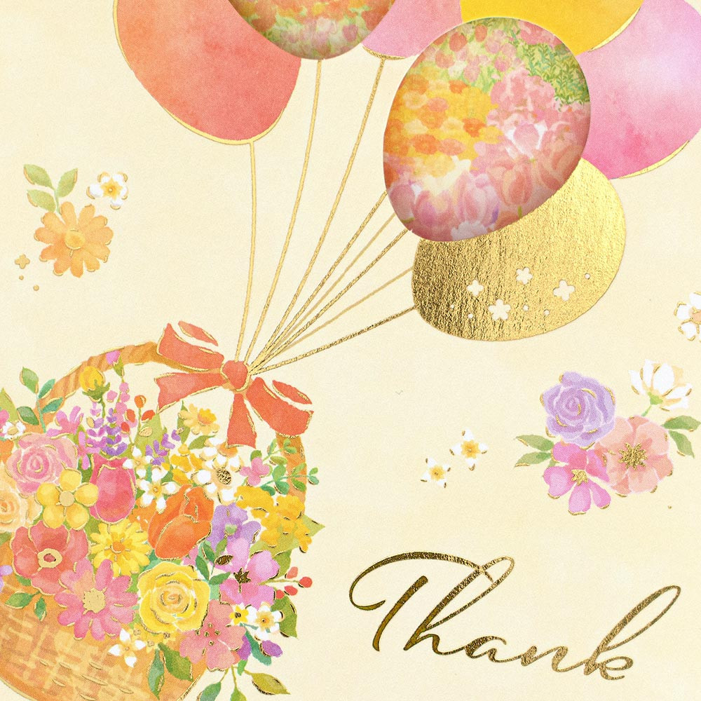 色彩豊かな花かごと風船が華やかなカードです。