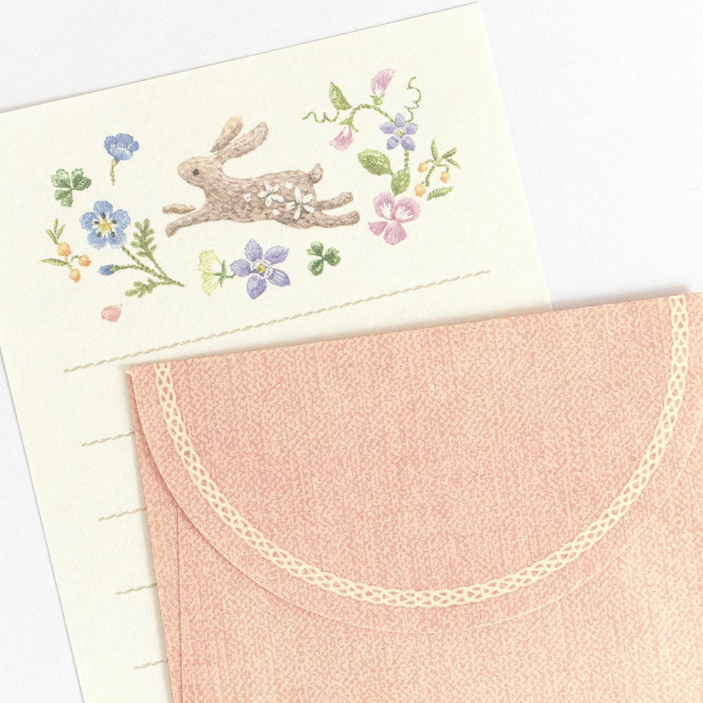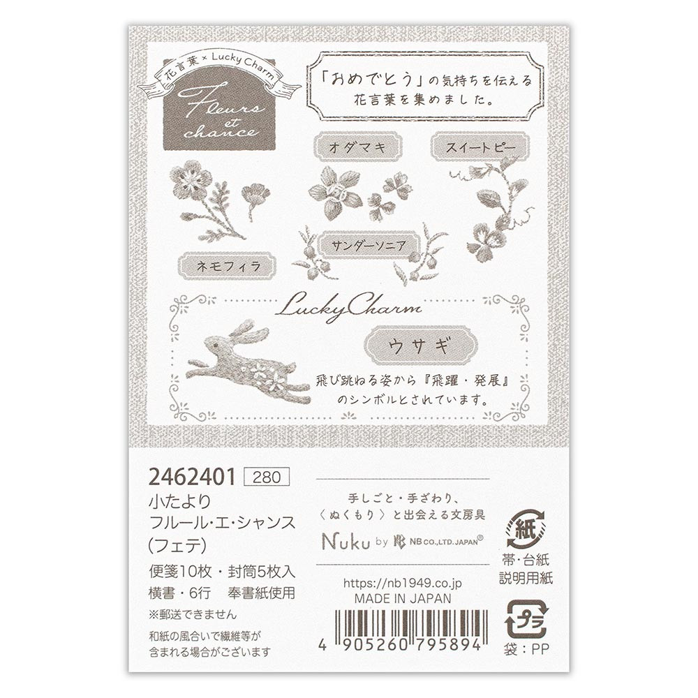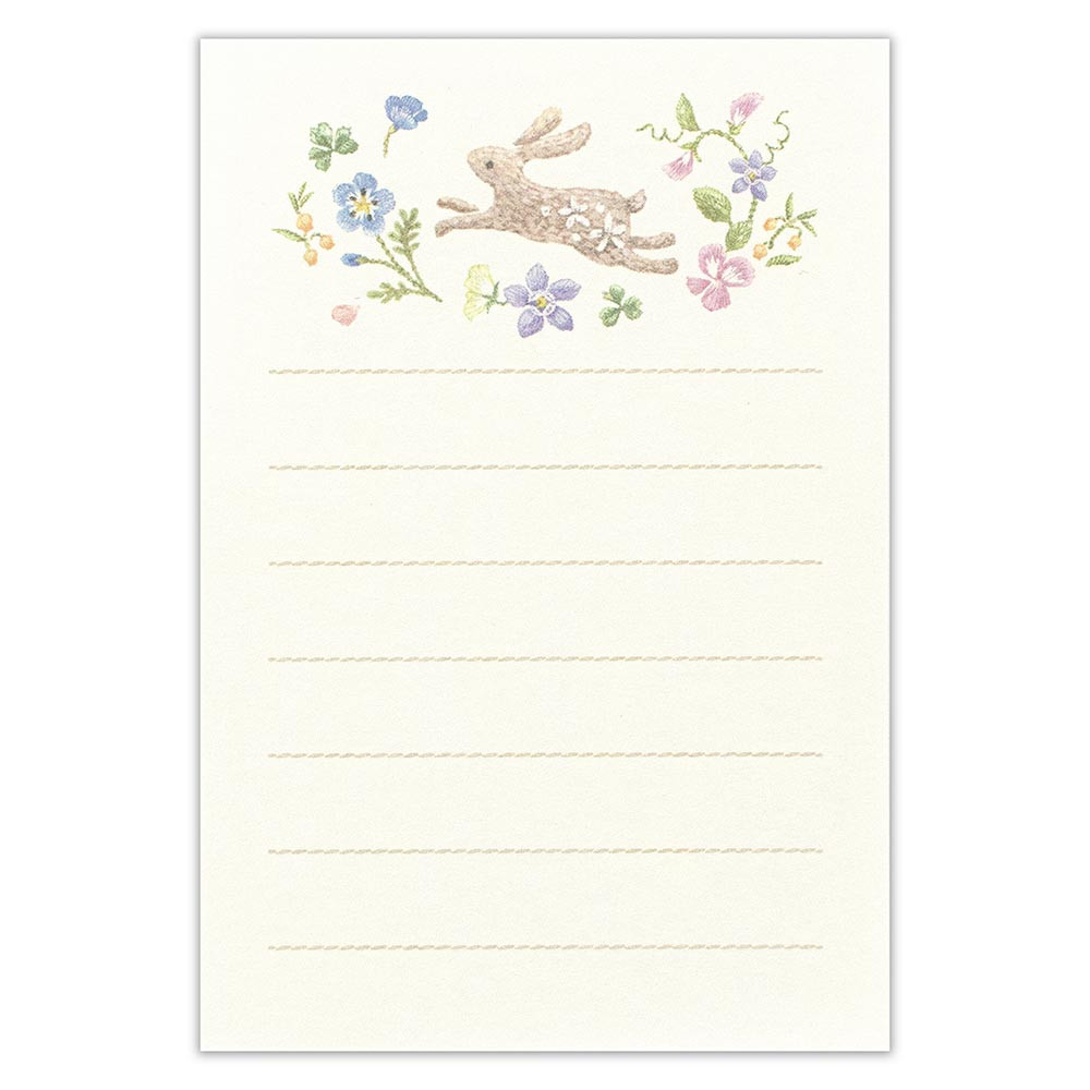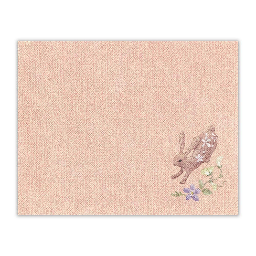 「おめでとう」の気持ちを伝える花言葉の花と、「飛躍・発展」の象徴とされるウサギのモチーフを柔らかい刺繍タッチで描いたデザインです。