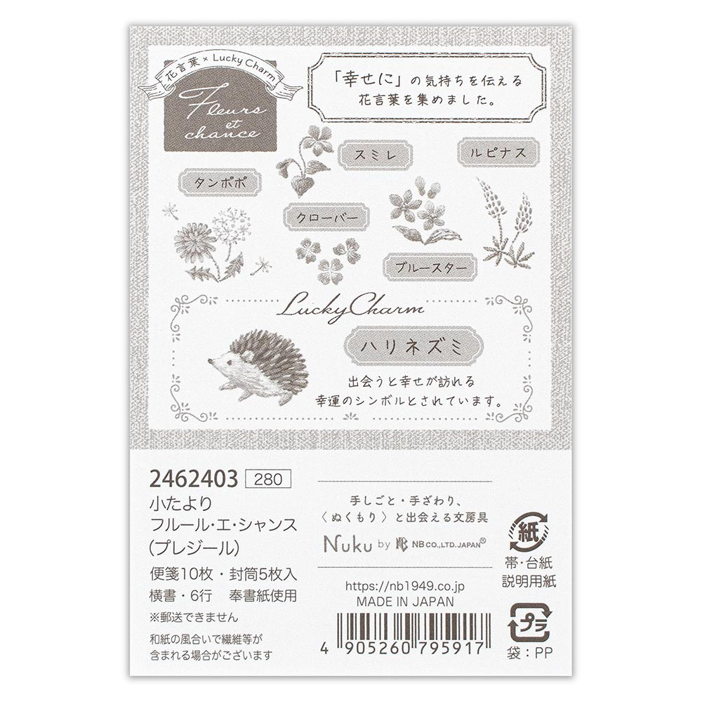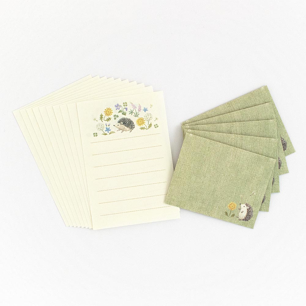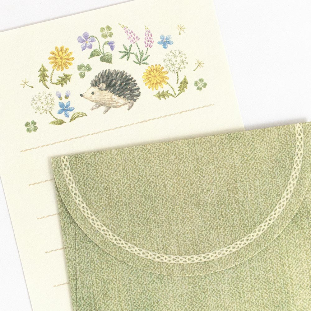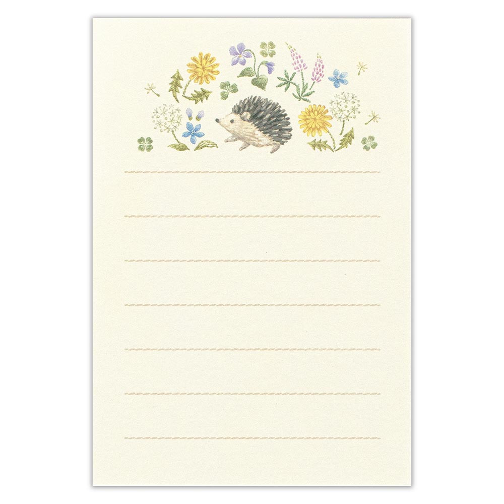 「幸せに」の気持ちを伝える花言葉の花と、「幸運」のシンボルとされるハリネズミを柔らかい刺繍タッチで描いたデザインです。