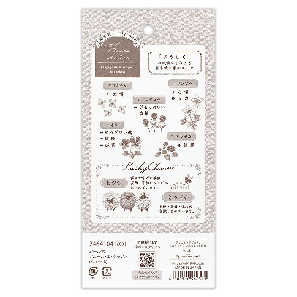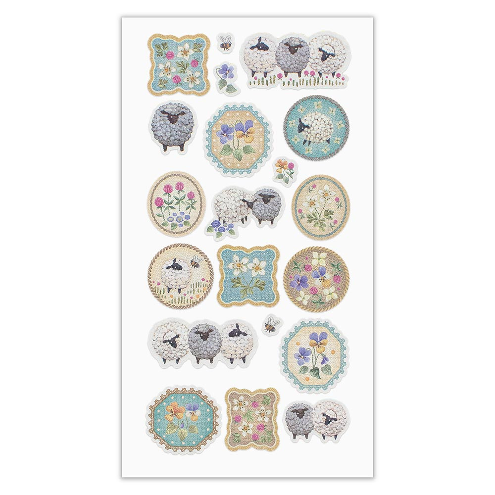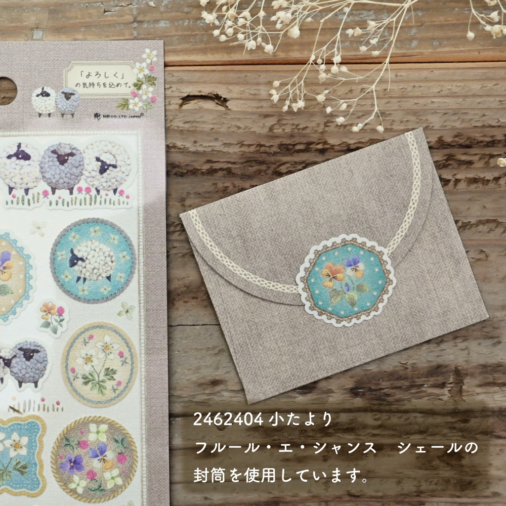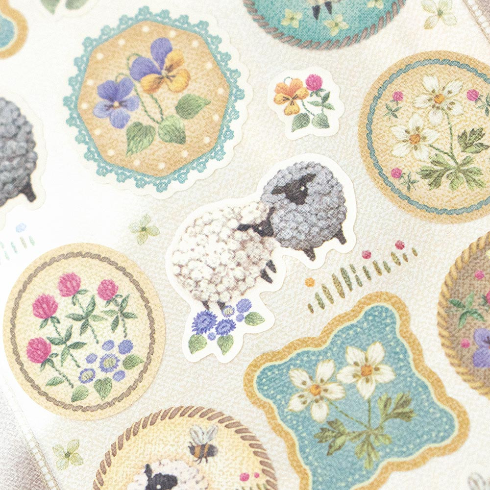 「よろしく」の気持ちを伝える花言葉の花と、「安泰・平和」のシンボルとされるヒツジ、「幸運・繁栄・達成」の象徴とされるミツバチを柔らかい刺繍タッチで描いたシールです。