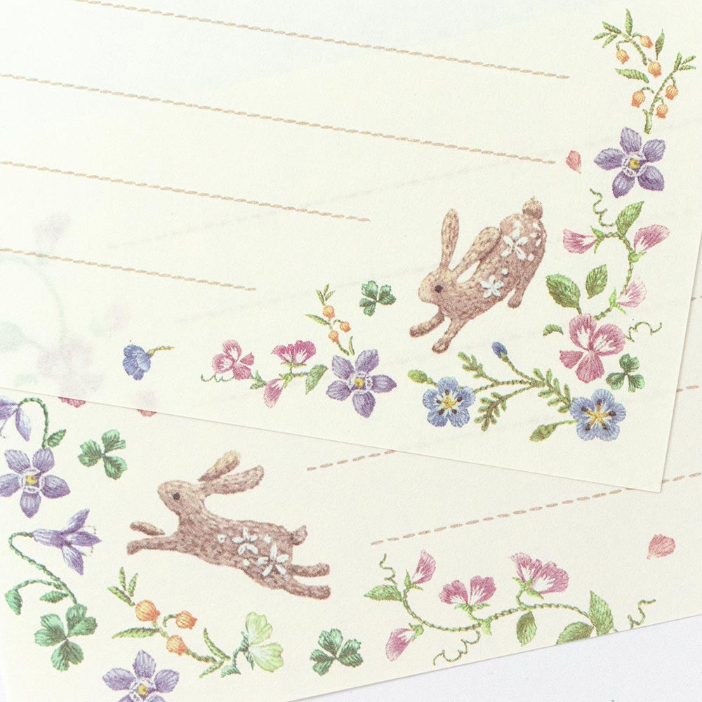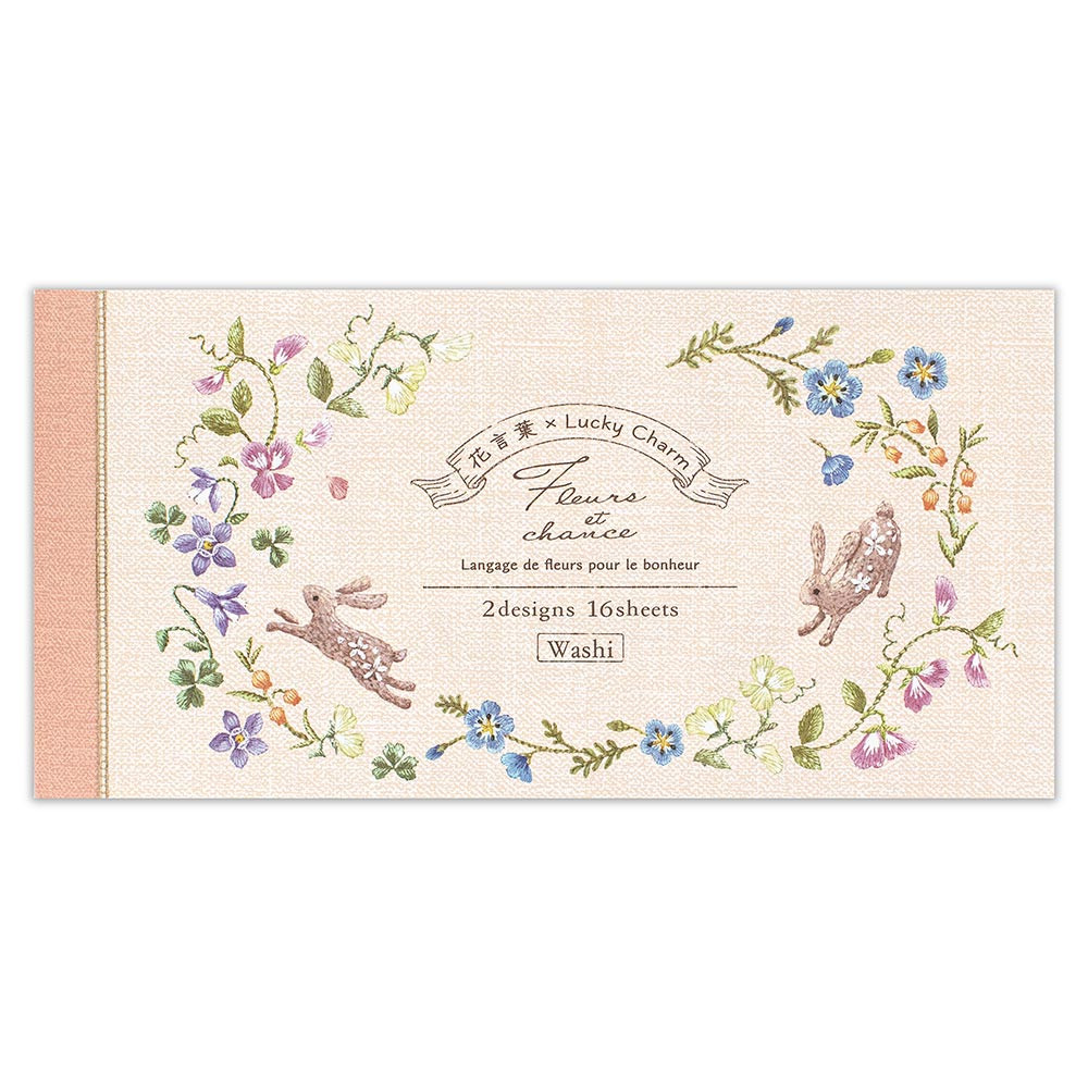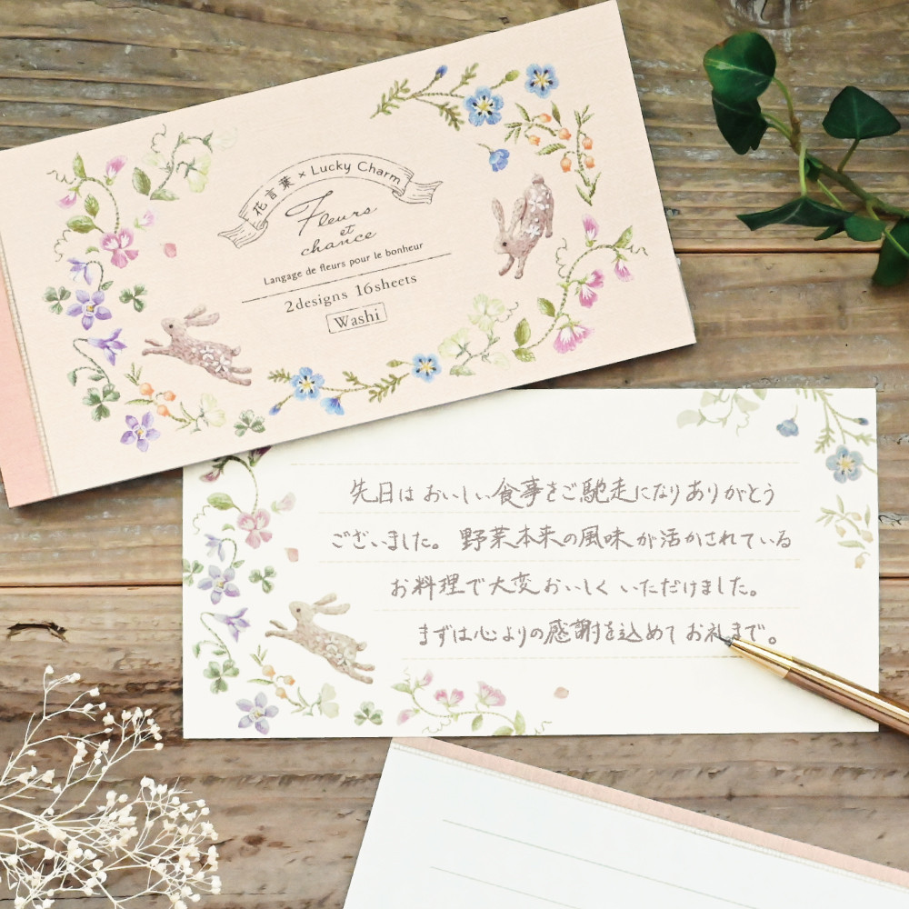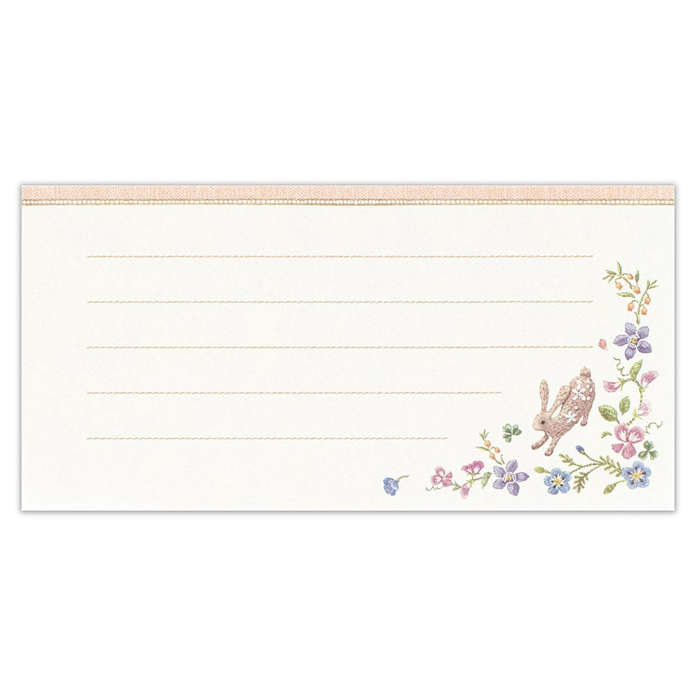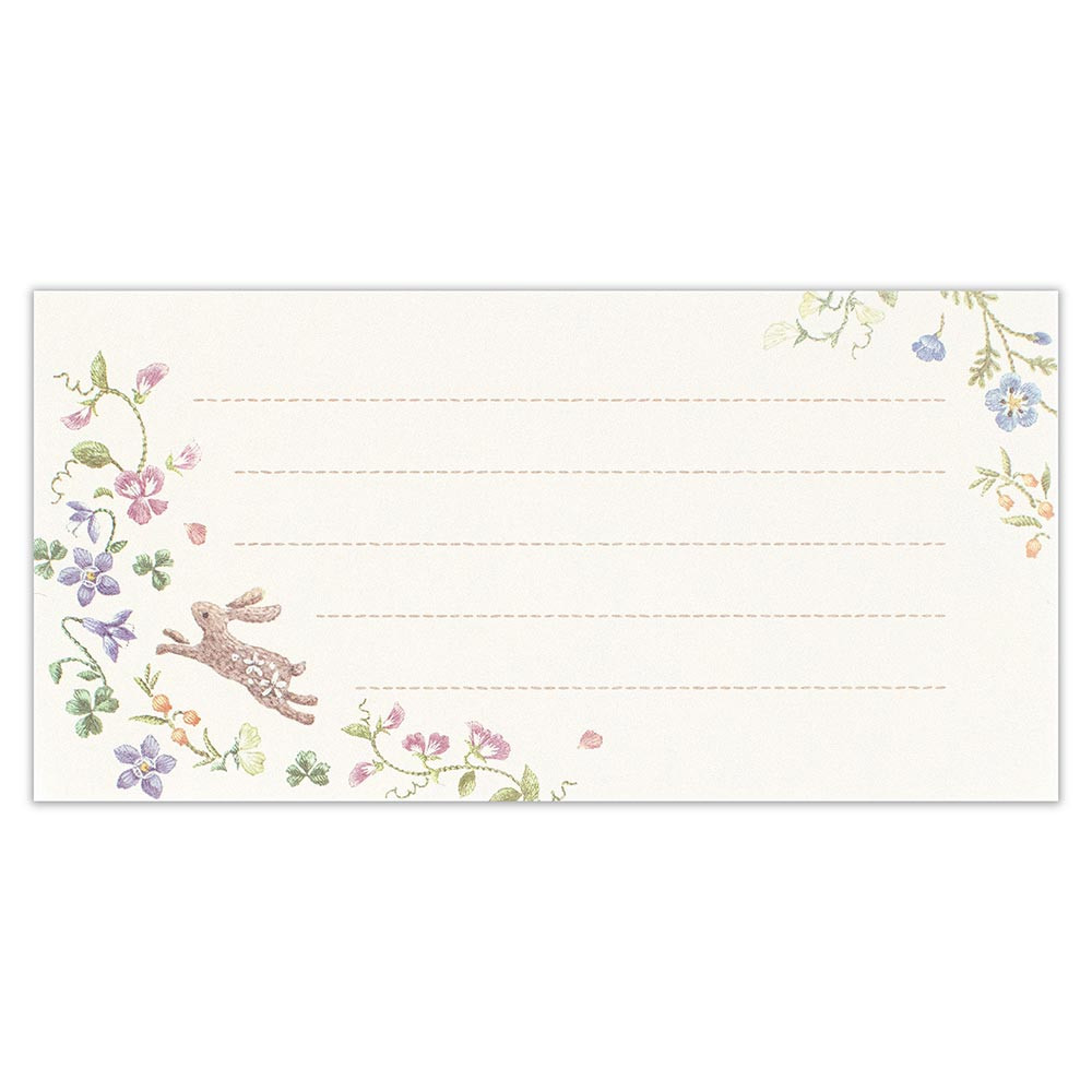 「おめでとう」の気持ちを伝える花言葉の花と、「飛躍・発展」の象徴とされるウサギのモチーフを柔らかい刺繍タッチで描いたデザインです。
