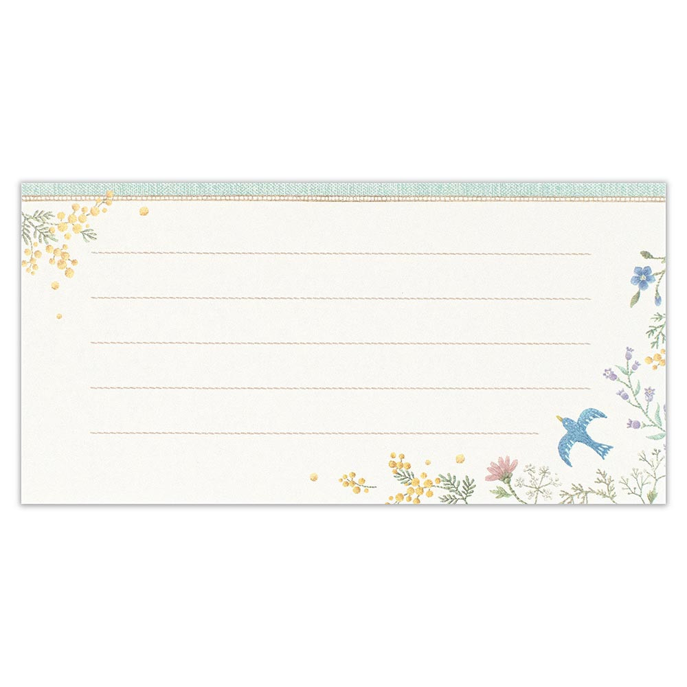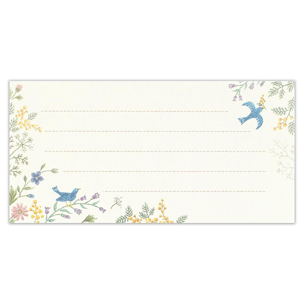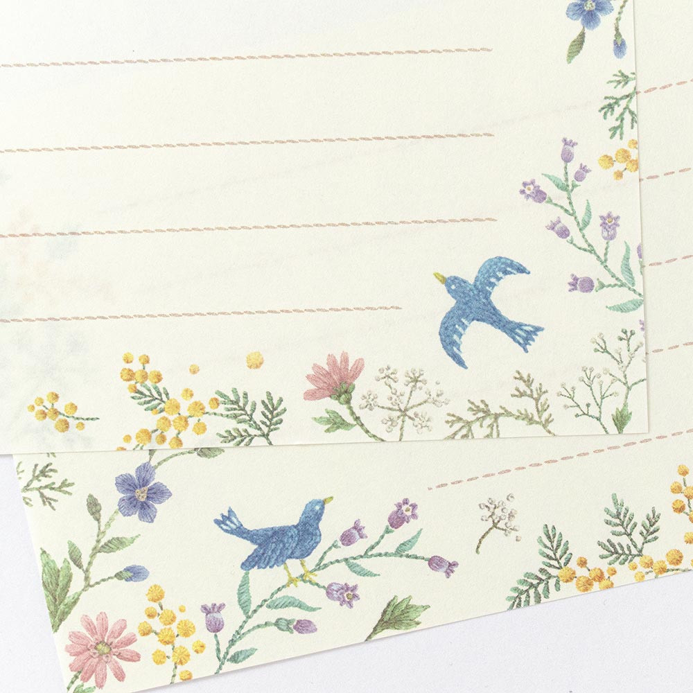 「ありがとう」の気持ちを伝える花言葉の花と、希望のシンボルとされる青い鳥を柔らかい刺繍タッチで描いたデザインです。