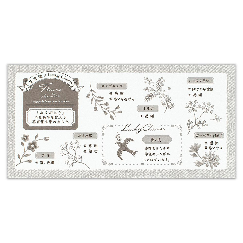 花言葉からセレクトした花たちとラッキーチャームを描いたシリーズ。