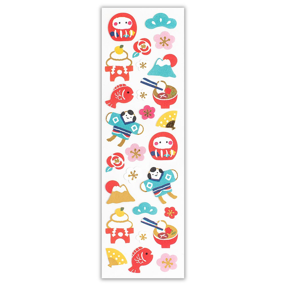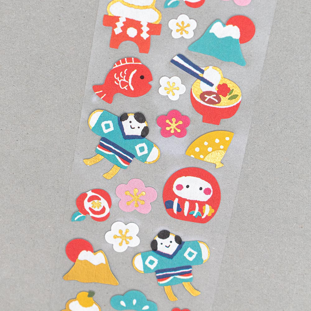 カラフルな色合いとキラリと光る箔押しが華やかで、お年玉袋の封緘や年賀状のワンポイントにオススメです。