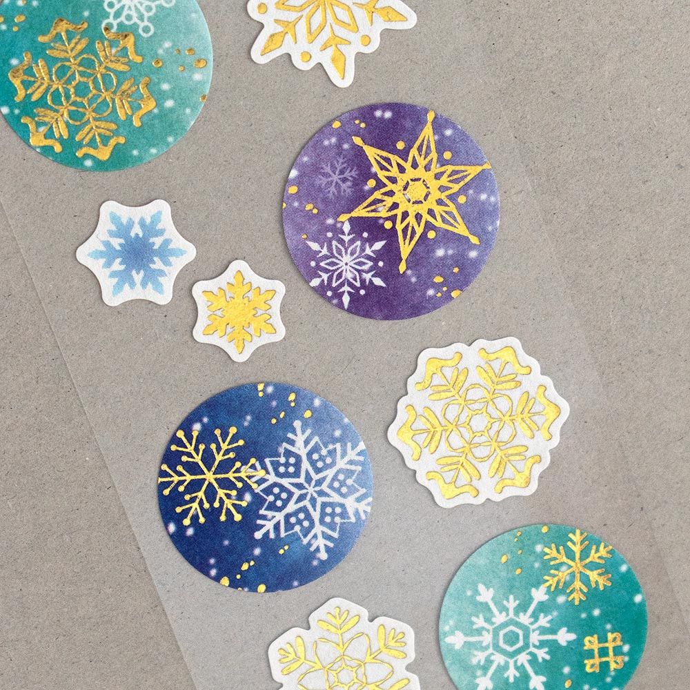 金箔押し加工で表現した繊細な雪の結晶がきらめく、冬にぴったりのデザインです。