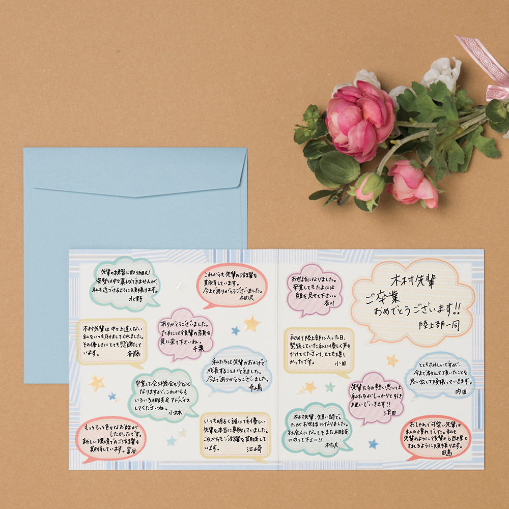 シールを配るだけで、簡単に大勢で寄せ書きができる便利な色紙シールです。