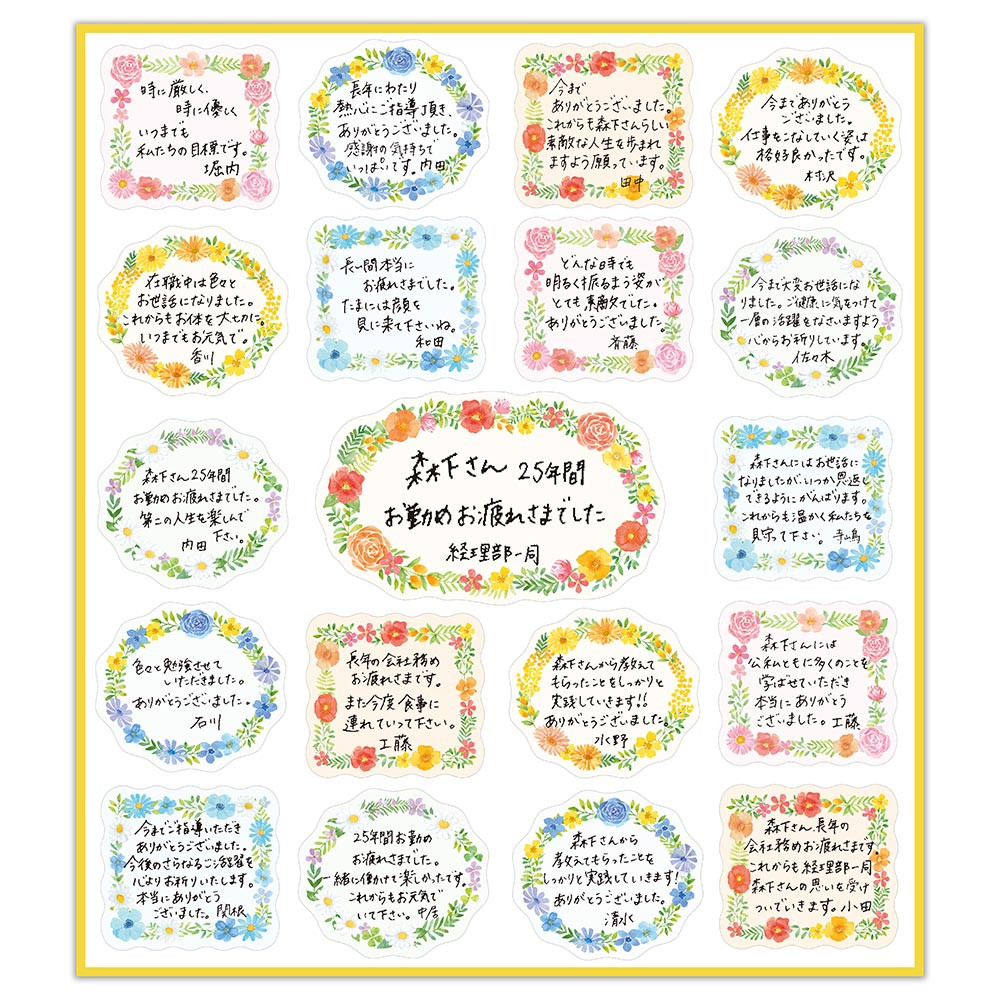 シールを配るだけで、簡単に大勢で寄せ書きできる便利な色紙シールです。カラーペンを用意したり、こっそり回す手間がなく、黒ペンだけでも華やかな色紙が完成します。