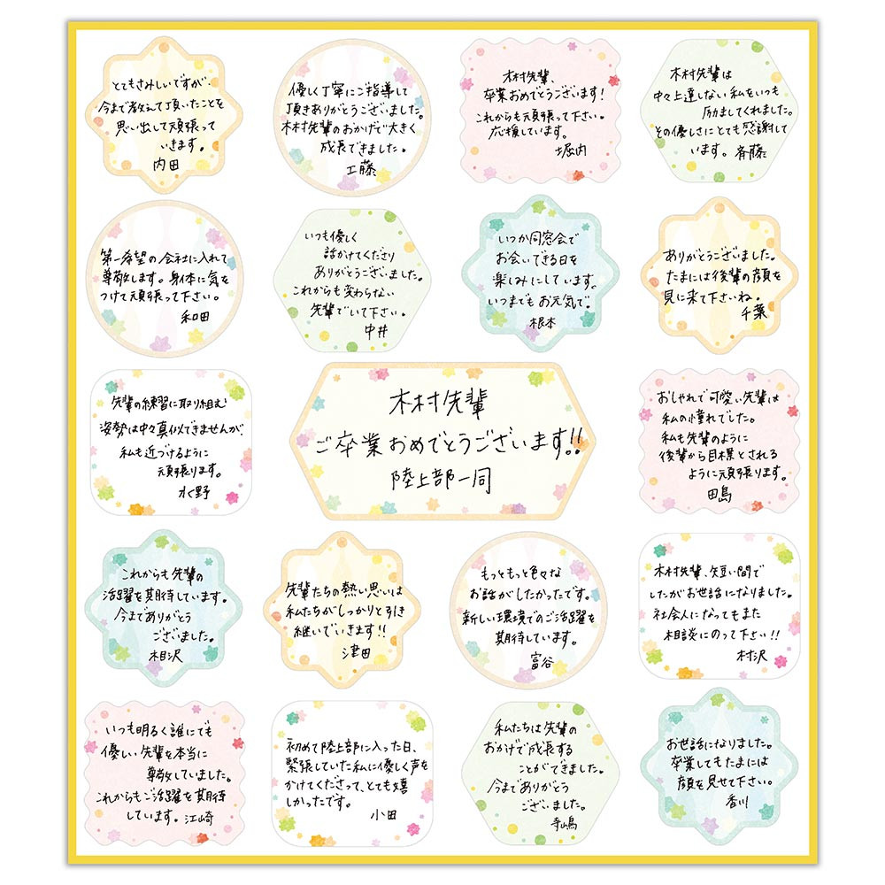 シールを配るだけで、簡単に大勢で寄せ書きできる便利な色紙シールです。カラーペンを用意したり、こっそり回す手間がなく、黒ペンだけでも可愛らしい色紙が完成します。