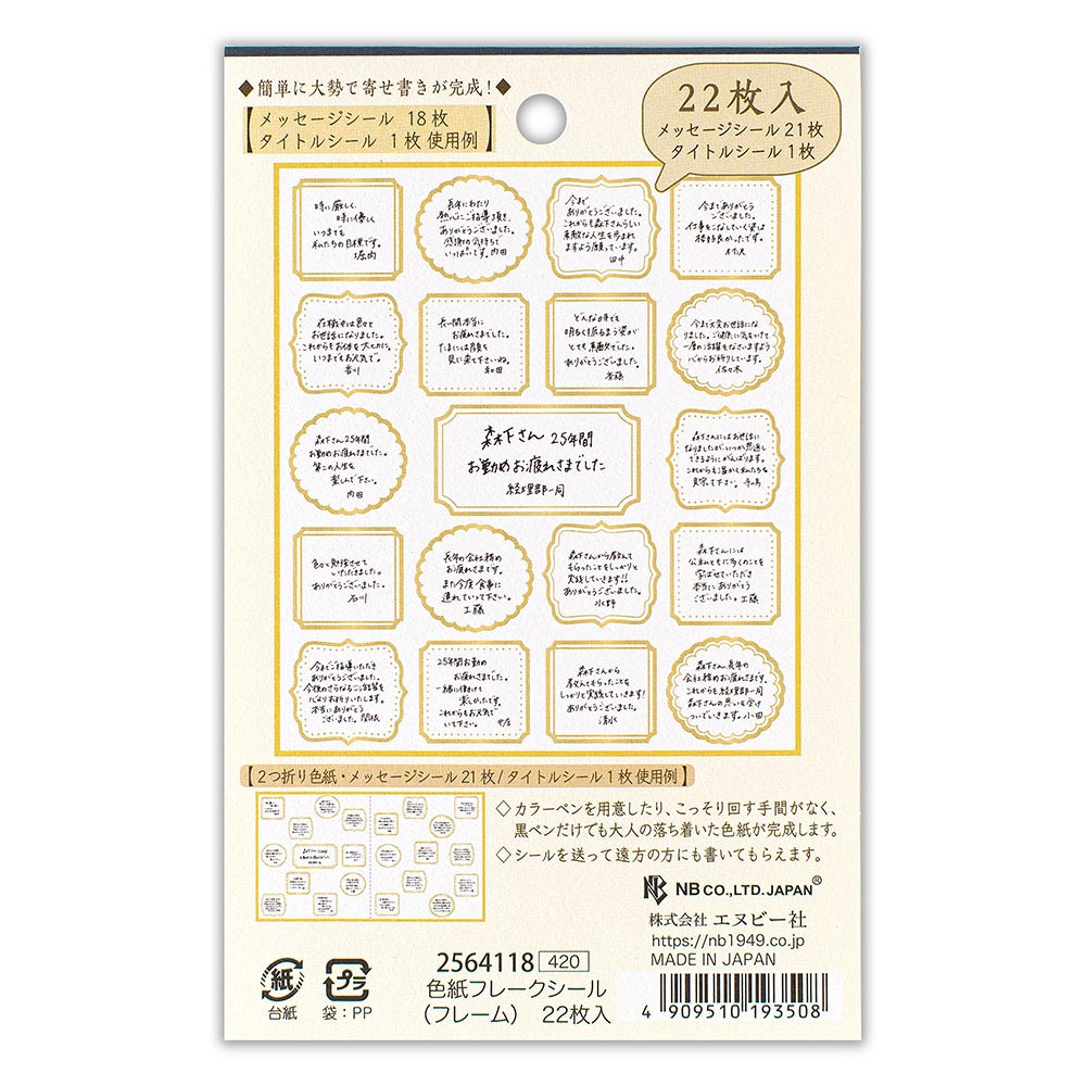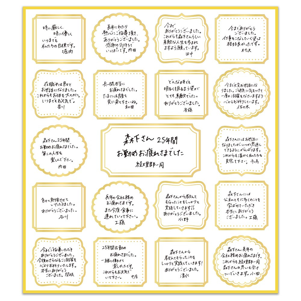 シールを配るだけで、簡単に大勢で寄せ書きできる便利な色紙シールです。カラーペンを用意したり、こっそり回す手間がなく、黒ペンだけでも大人の落ち着いた色紙が完成します。
