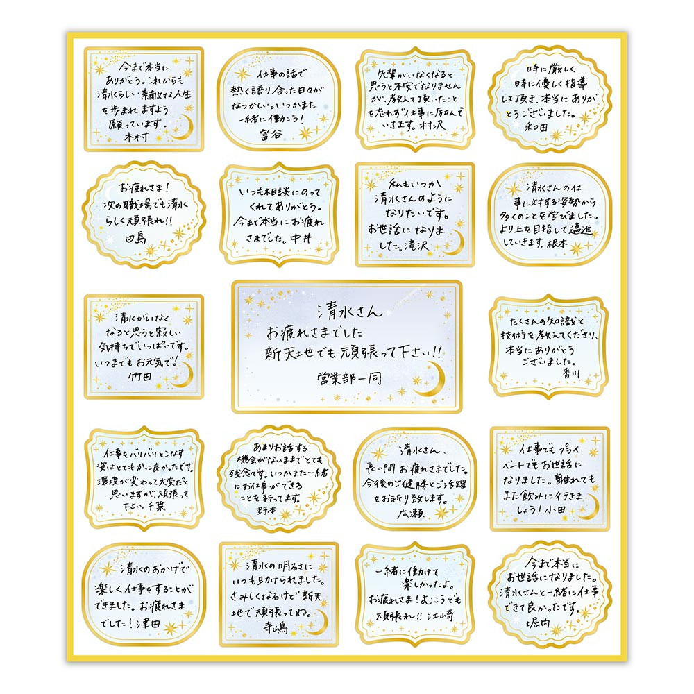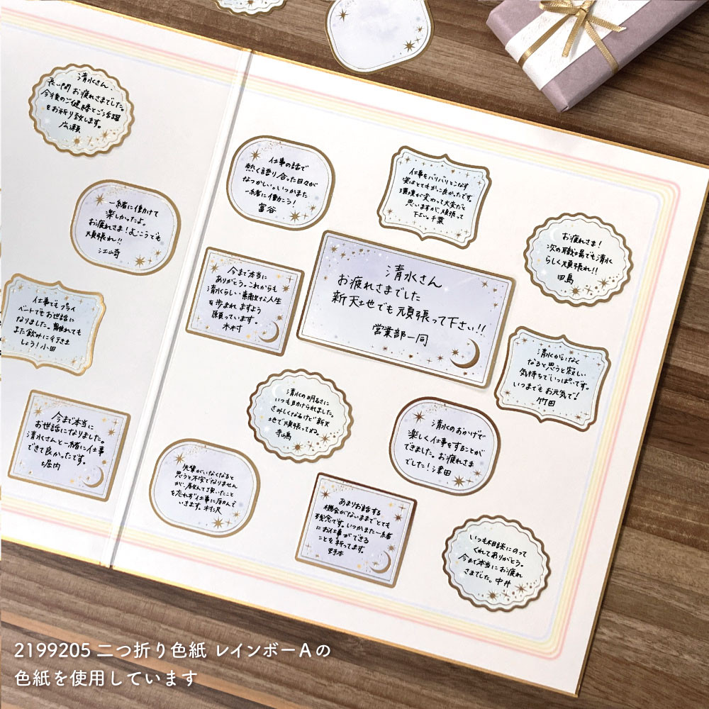 シールを配るだけで、簡単に大勢で寄せ書きできる便利な色紙シールです。カラーペンを用意したり、こっそり回す手間がなく、黒ペンだけでも華やかな色紙が完成します。