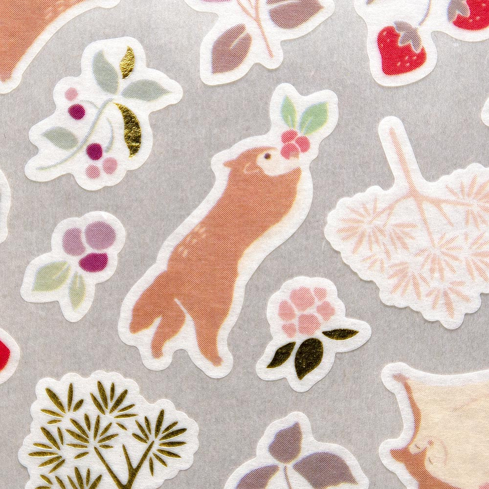 山に住む動物たちの暮らしを楽しく描きました。 貼ってはがせる和紙素材のマスキングシールです。 【花】