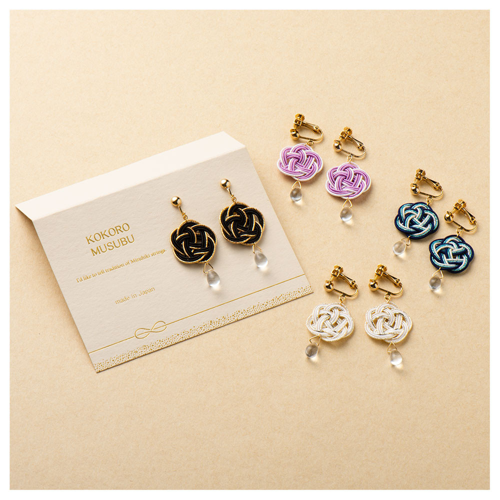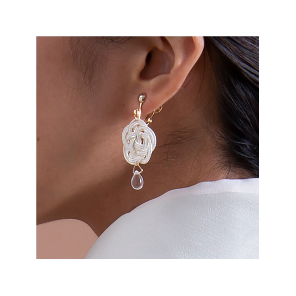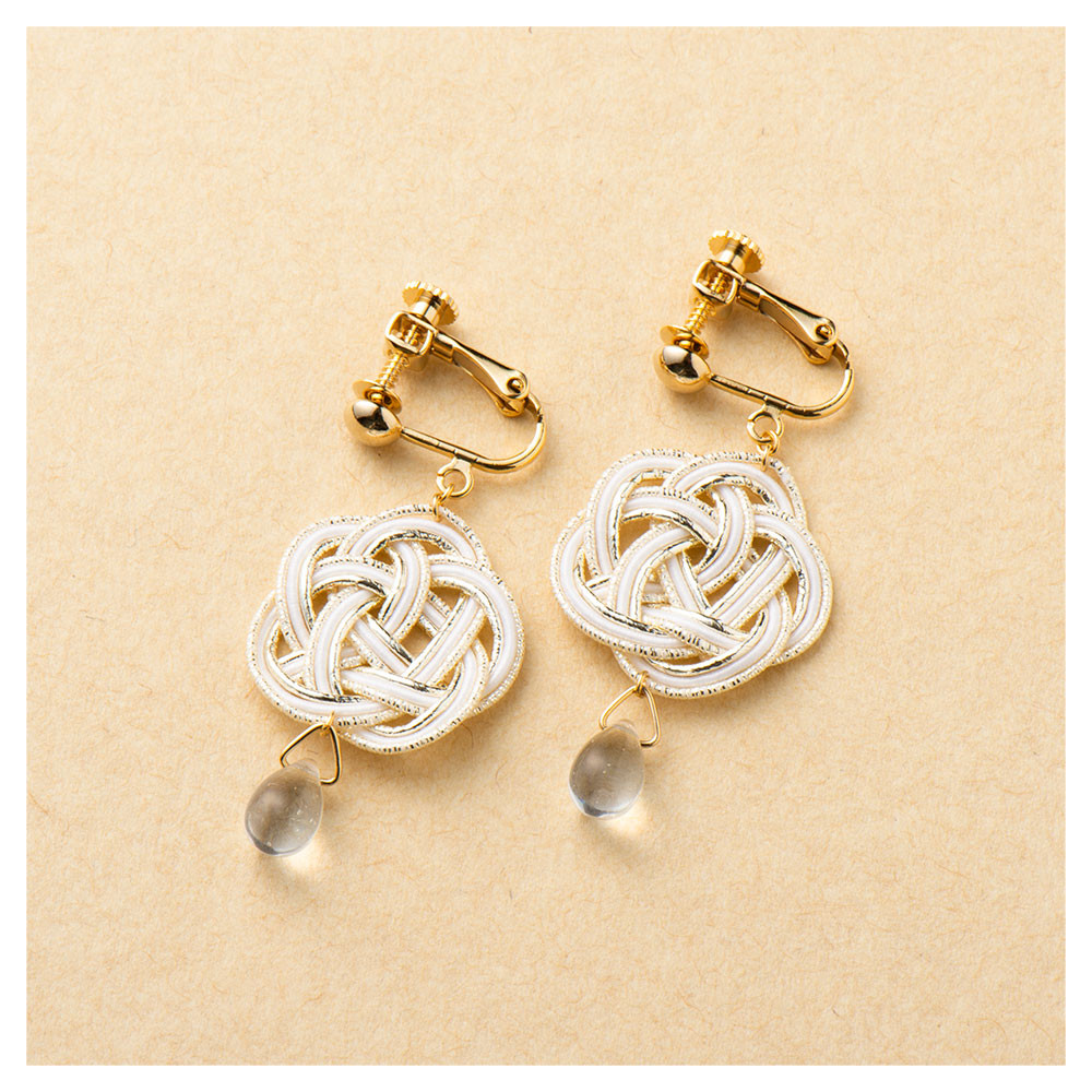 梅結びの水引モチーフのイヤリングが耳元を彩ります。