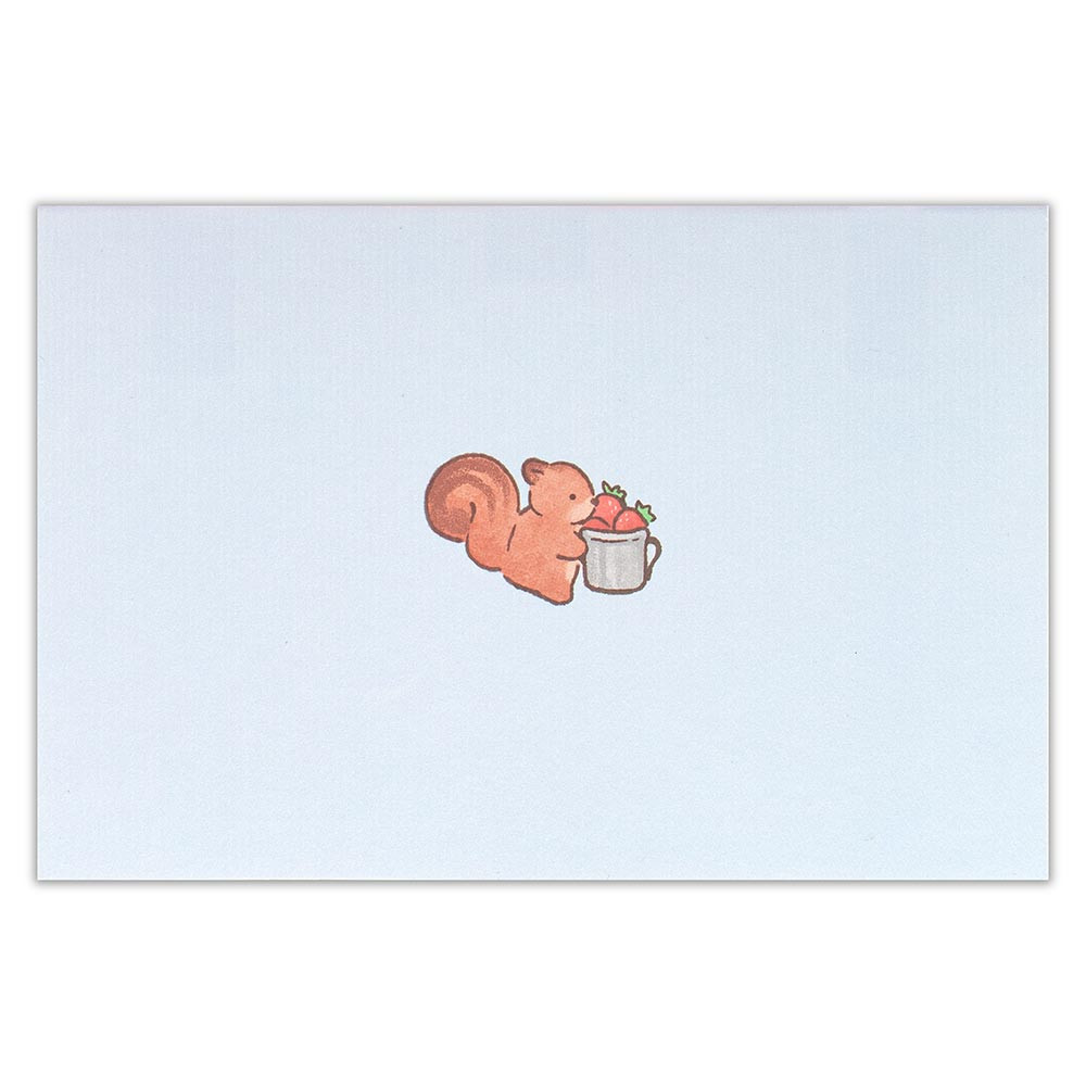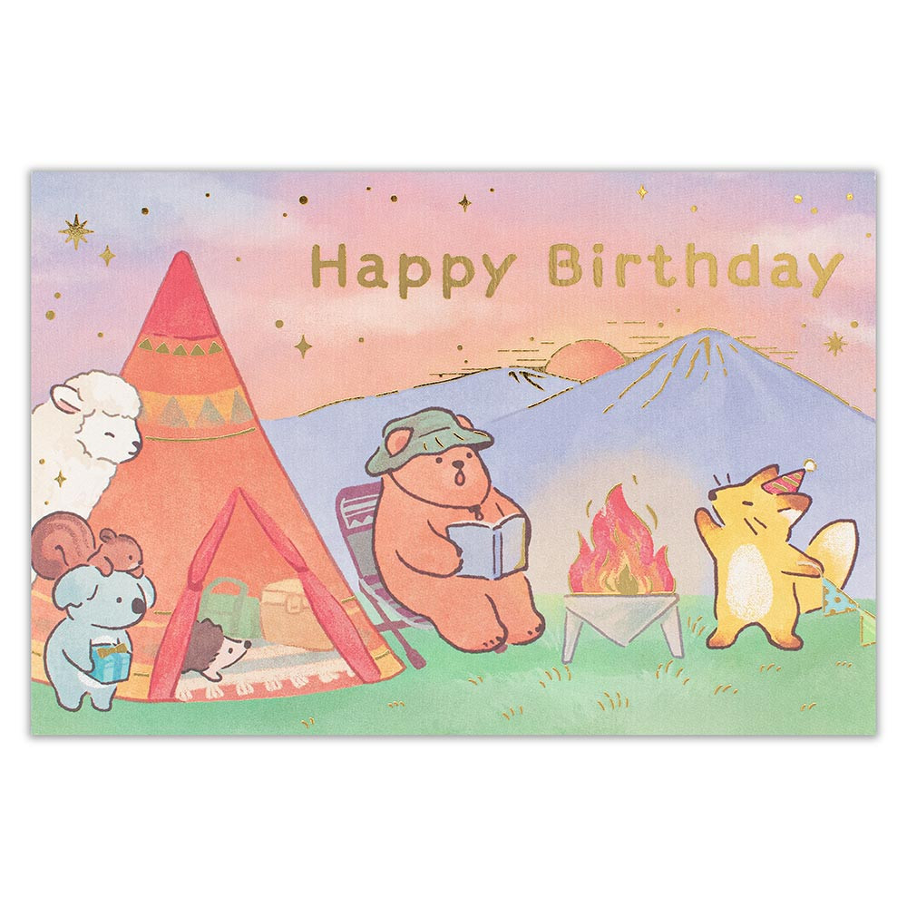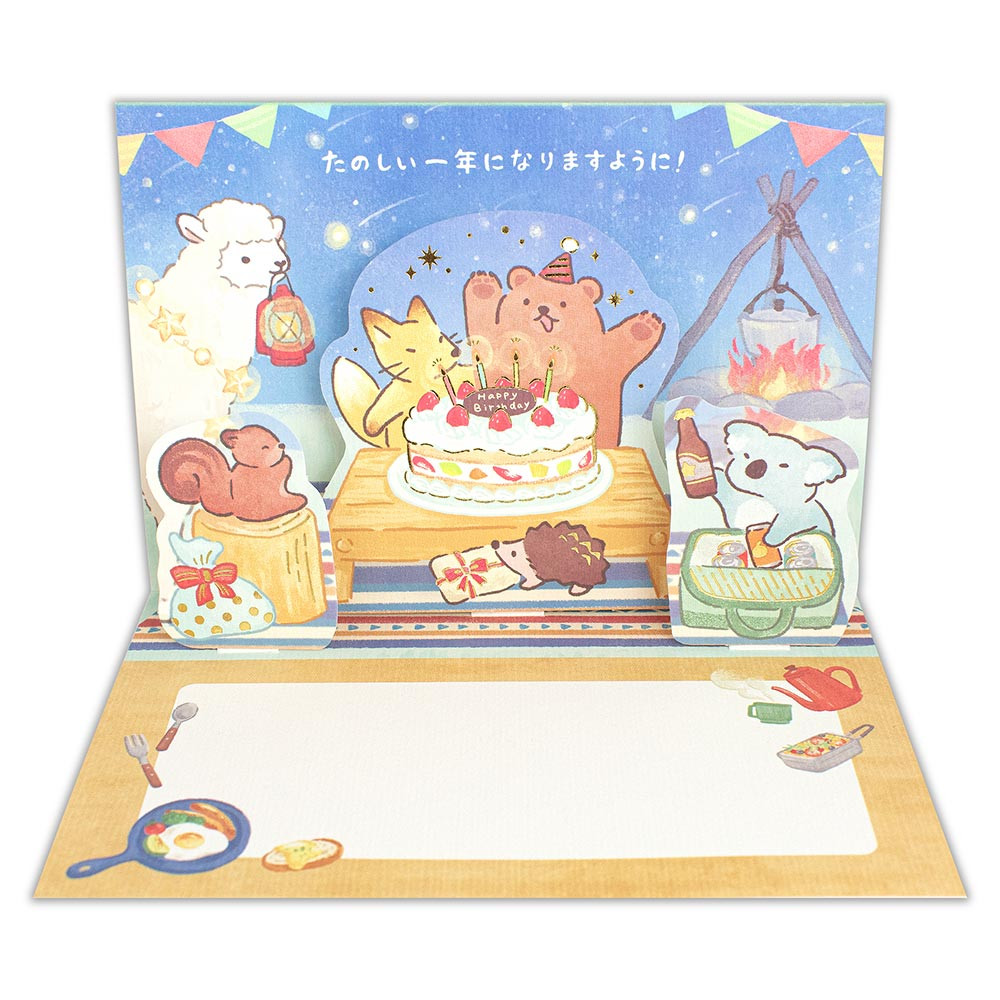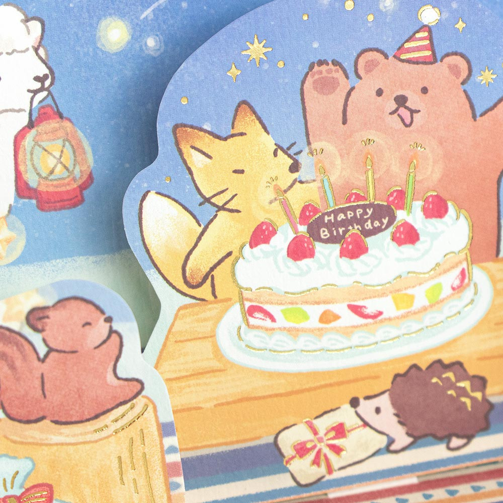 キャンプを楽しむクマや誕生日のお祝いをするキツネやリスたちを優しいタッチで描きました。