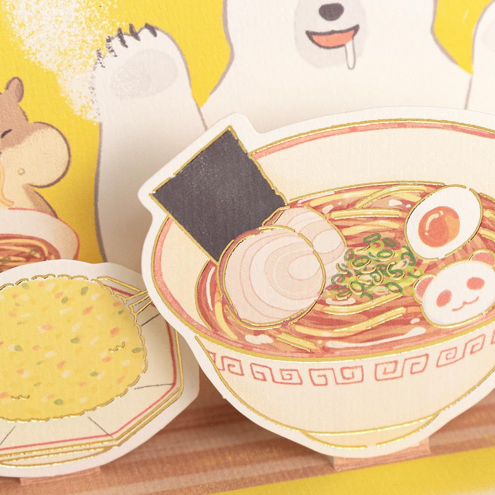 美味しそうなラーメンや料理を楽しむシロクマ、犬、リスを優しいタッチで描きました。