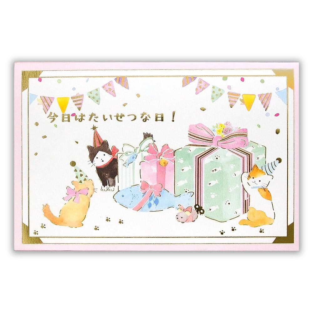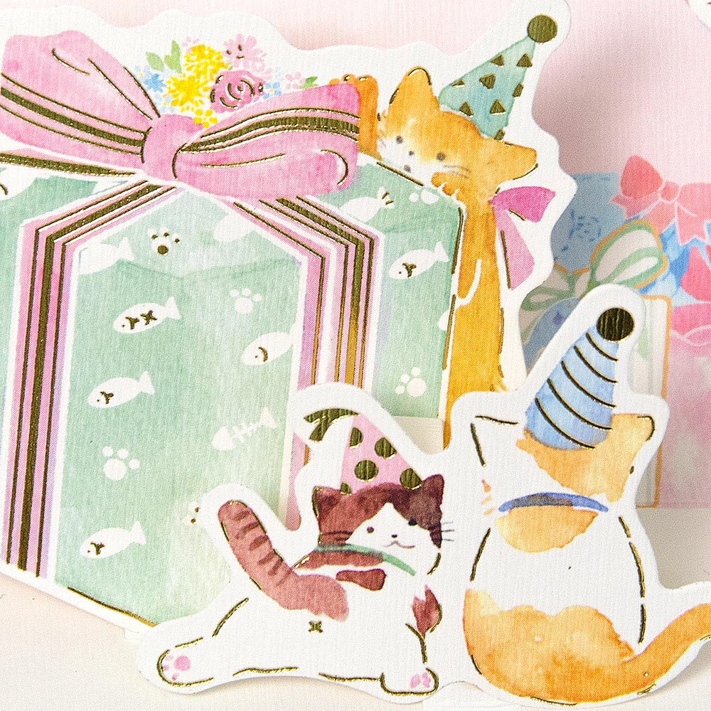 絵本のような優しい絵と物語が可愛らしい立体カードです。可愛らしい猫たちと大きなプレゼントで明るくお誕生日をお祝いします。