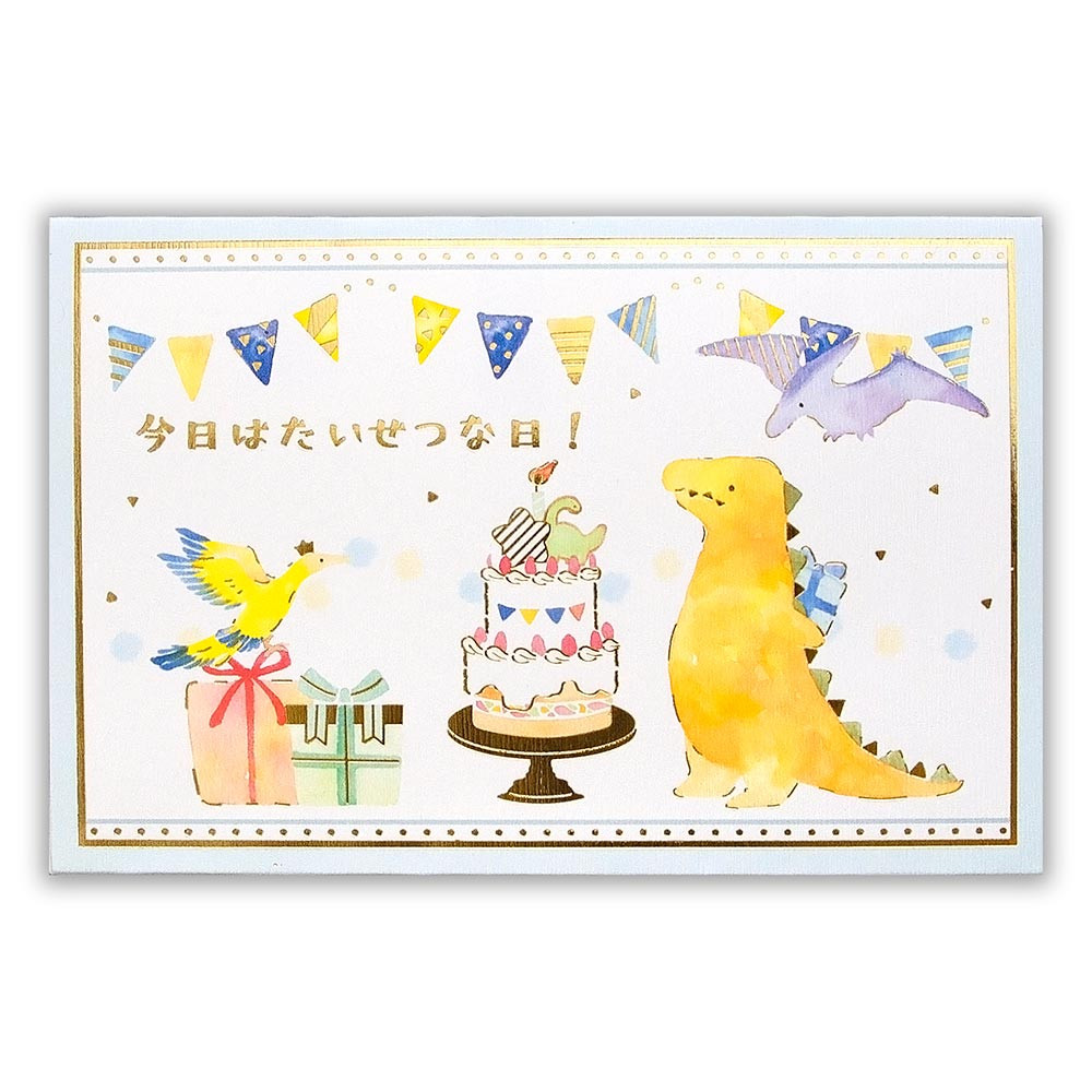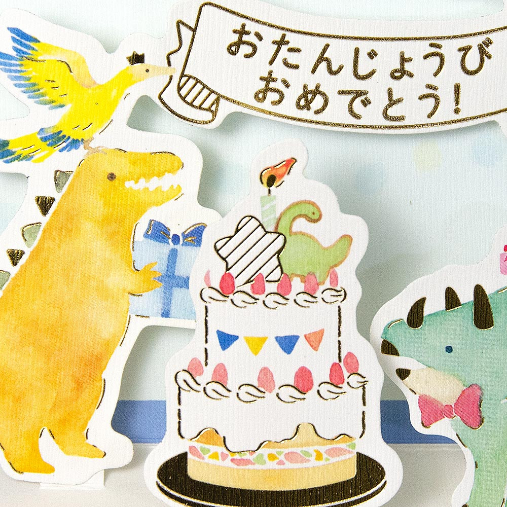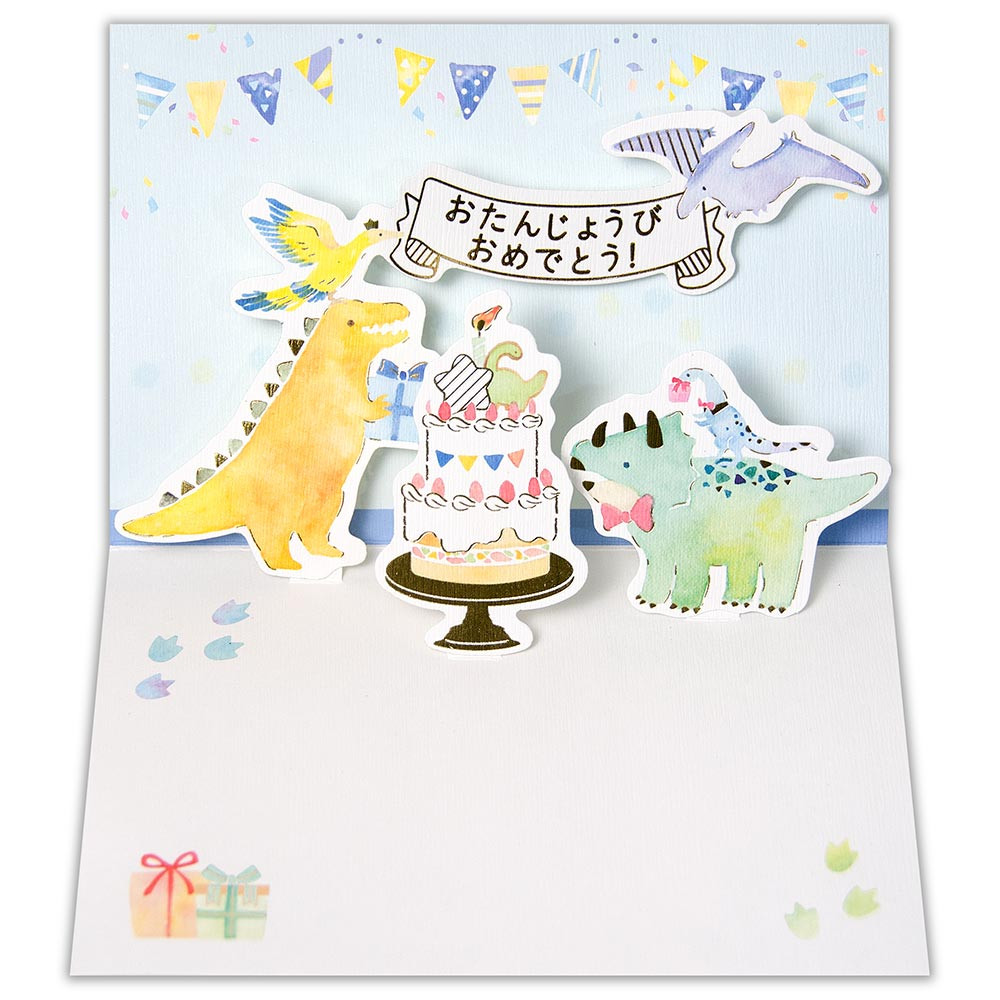 絵本のような優しい絵と物語が可愛らしい立体カードです。恐竜たちとケーキで明るくお誕生日をお祝いします。