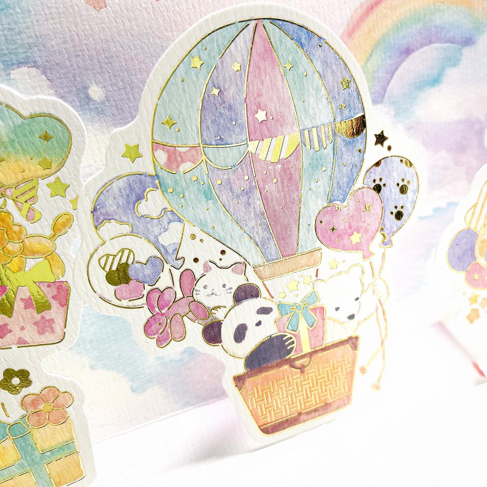 ゆめかわいいデザインです。気球や風船で空を飛ぶパンダやシロクマなど、可愛い動物たちが描かれています。
