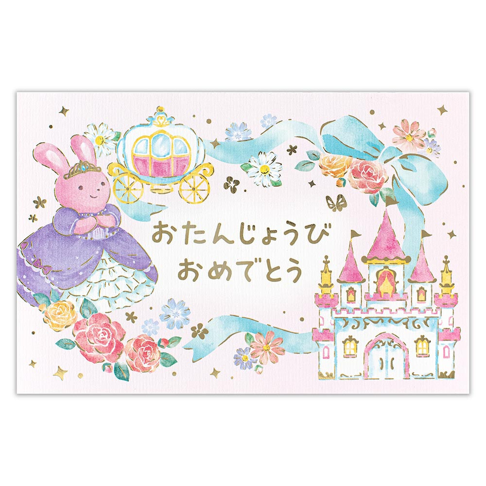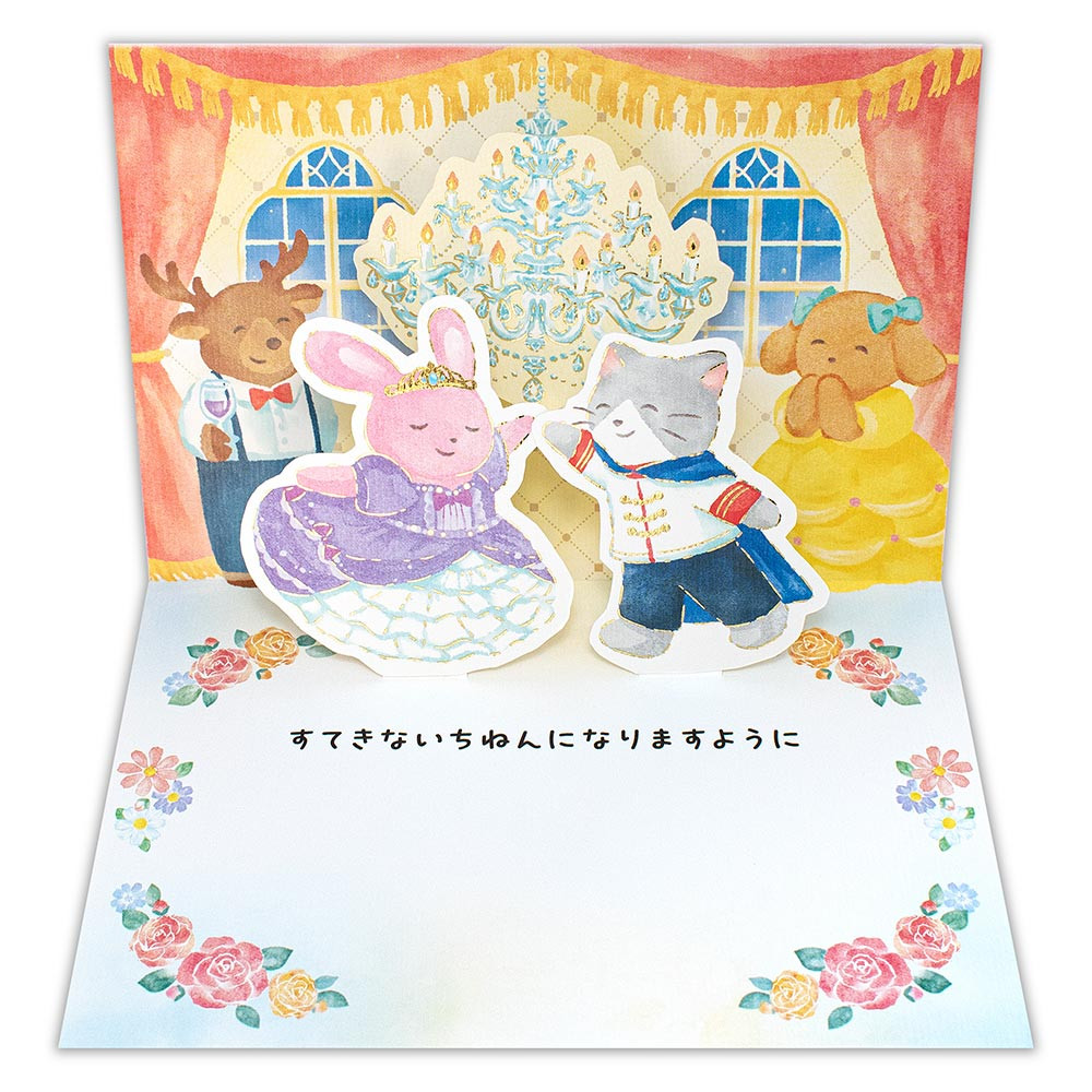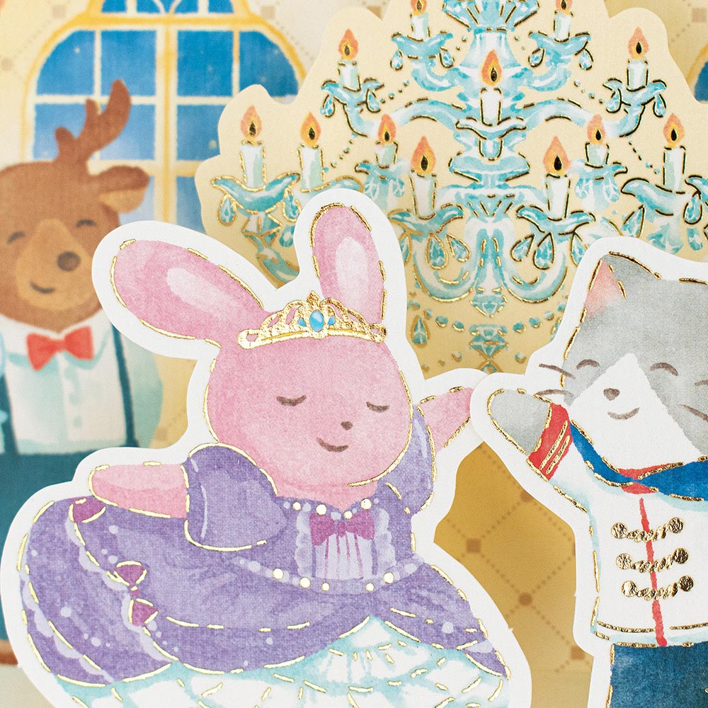 うさぎのお姫様と猫の王子様がお城で踊っているかわいらしいデザインです。