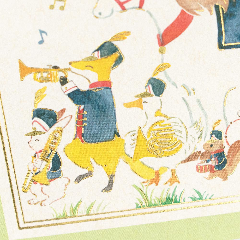 犬、うさぎ、鳥など動物たちのマーチングが描かれたお祝いにおすすめのデザインです。