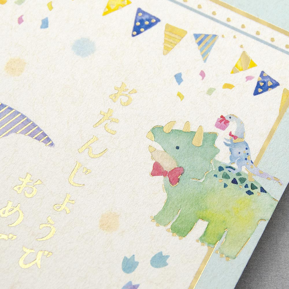 ティラノサウルス・トリケラトプスなど可愛い恐竜たちが描かれた、気軽に贈れる誕生日祝のし袋です。