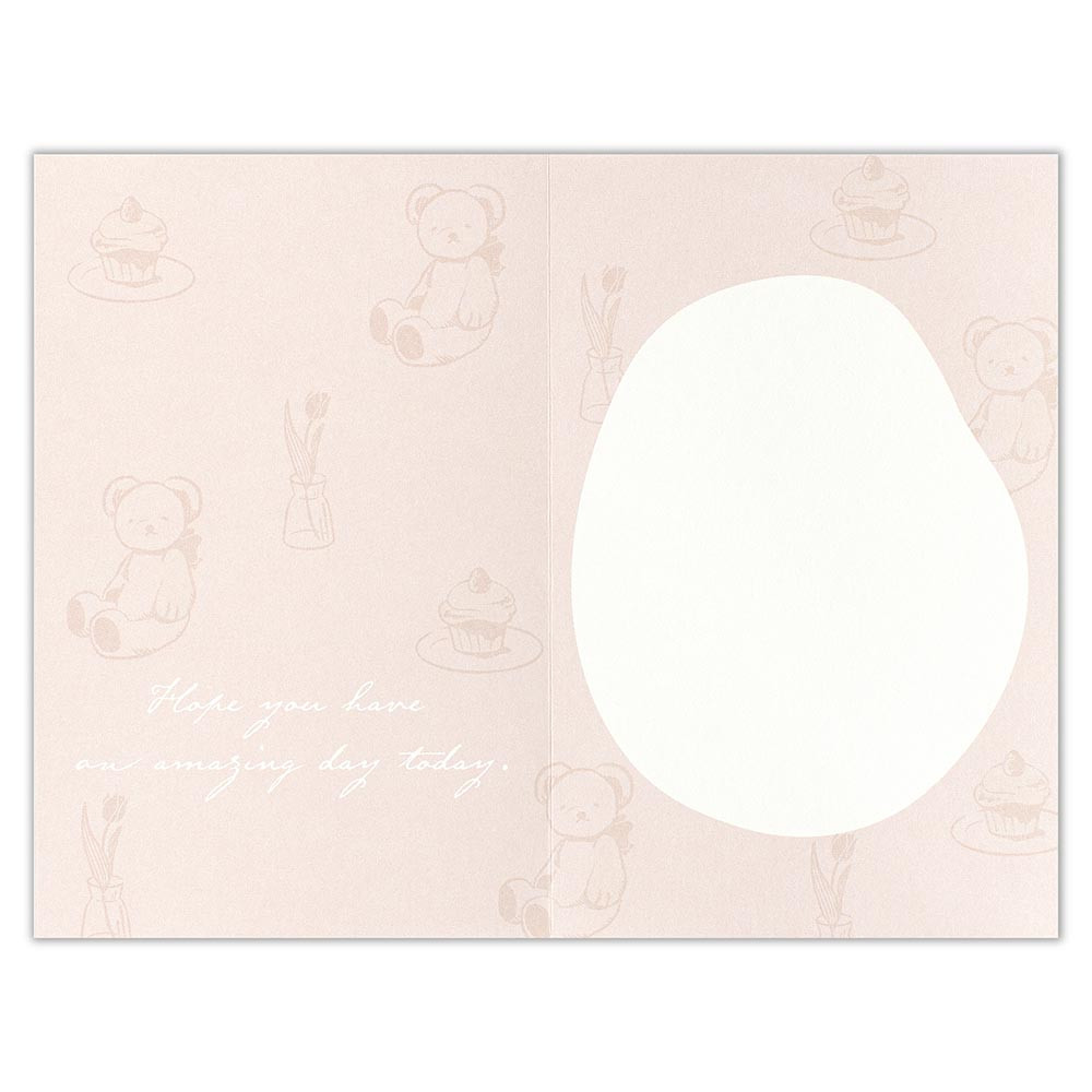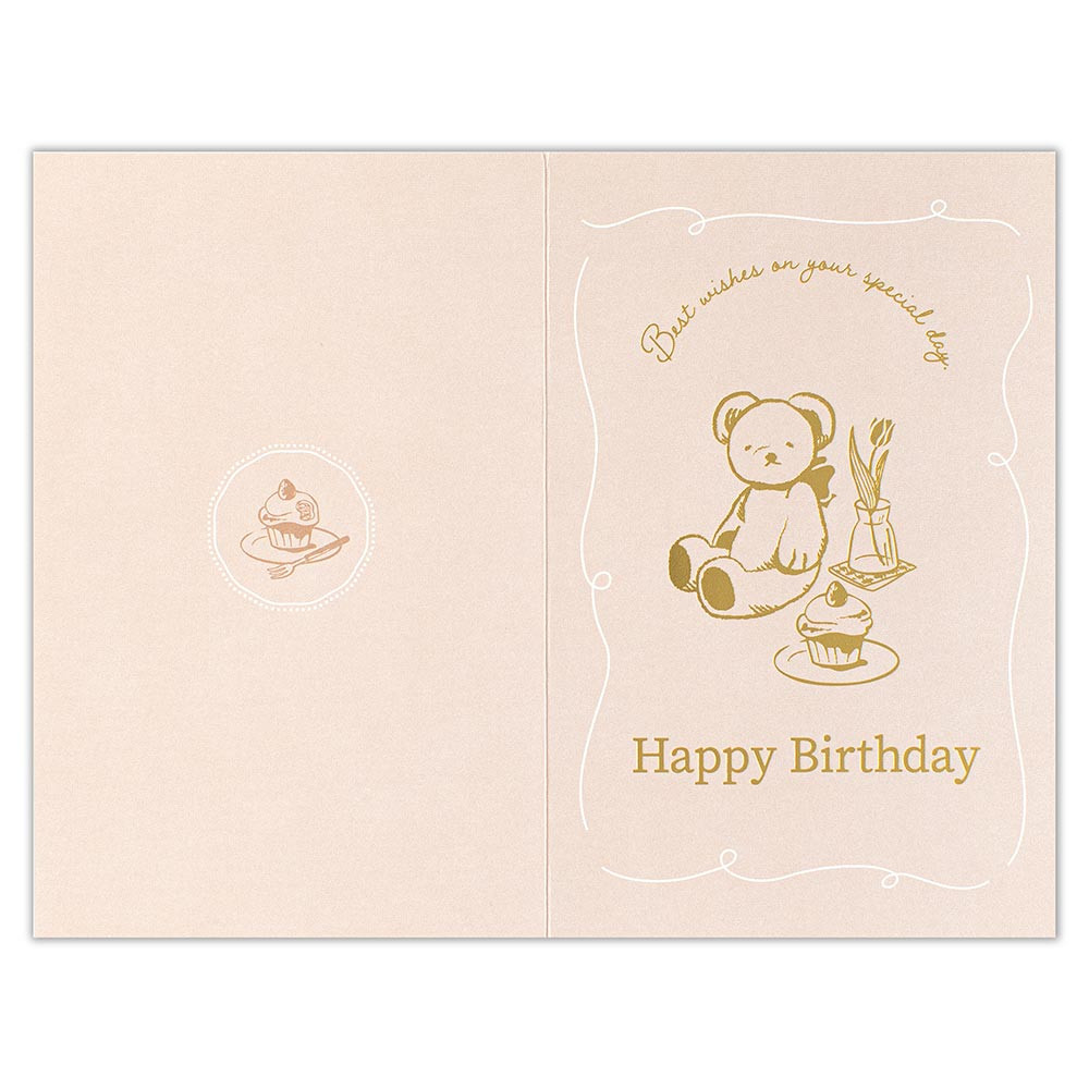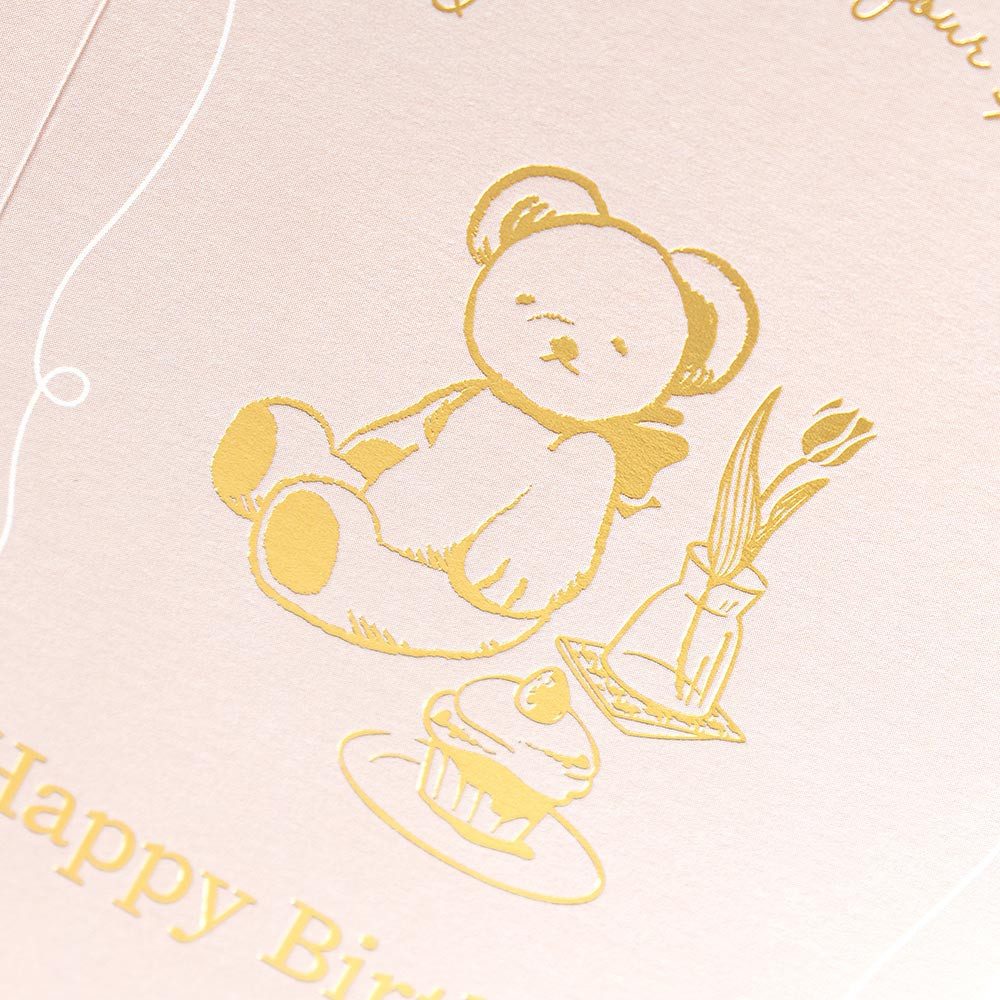 くすみカラーの本体に金箔押しを施した、おしゃれなバースデーカードです。 くまとチューリップが可愛らしい、お誕生日向けのデザインです。