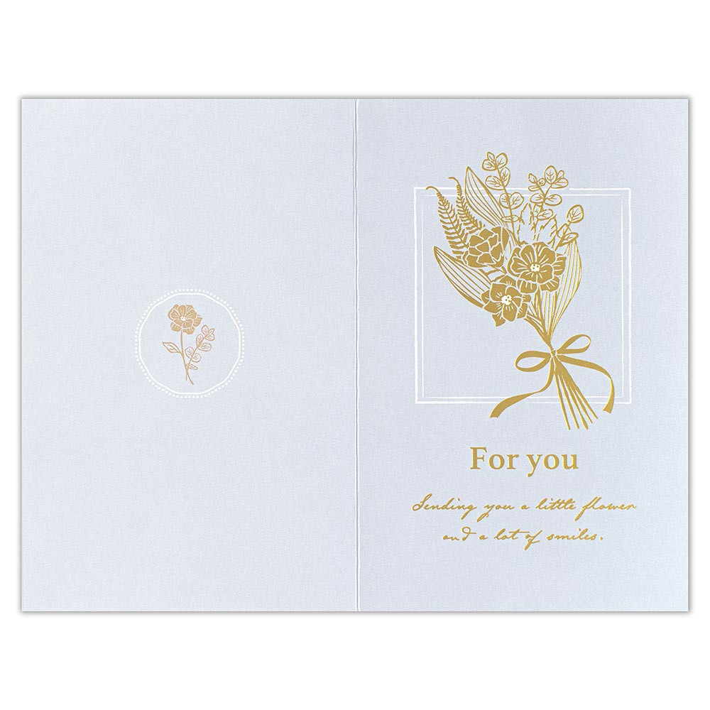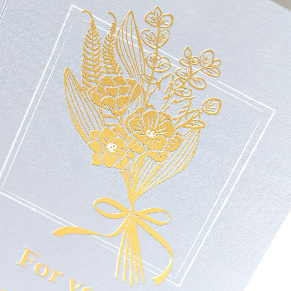 くすみカラーの本体に金箔押しを施した、おしゃれな多目的カードです。 シンプルにまとめたお花のデザインで、シーンを問わずお使いいただけます。