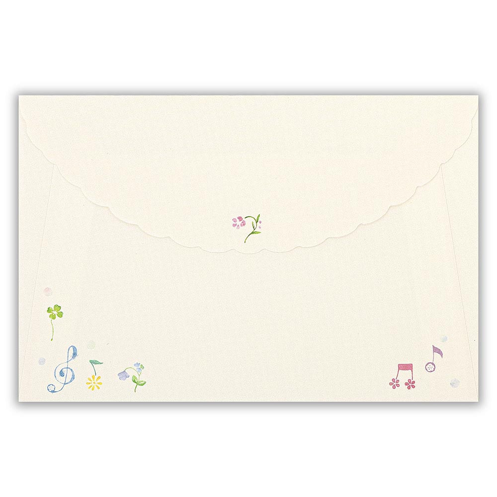 音符と草花のイラストに囲まれた封筒です。 色とりどりの音符と草花が優しく宛名を彩ります。 【音楽】
