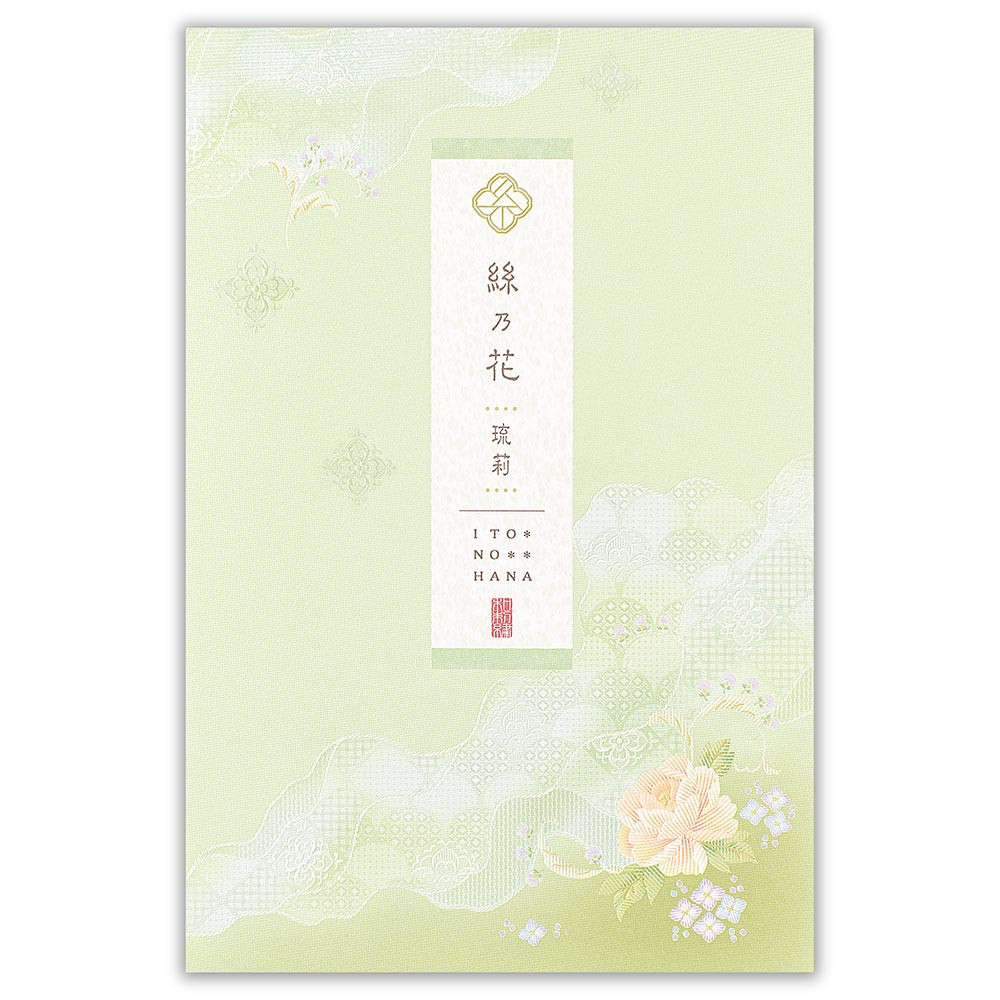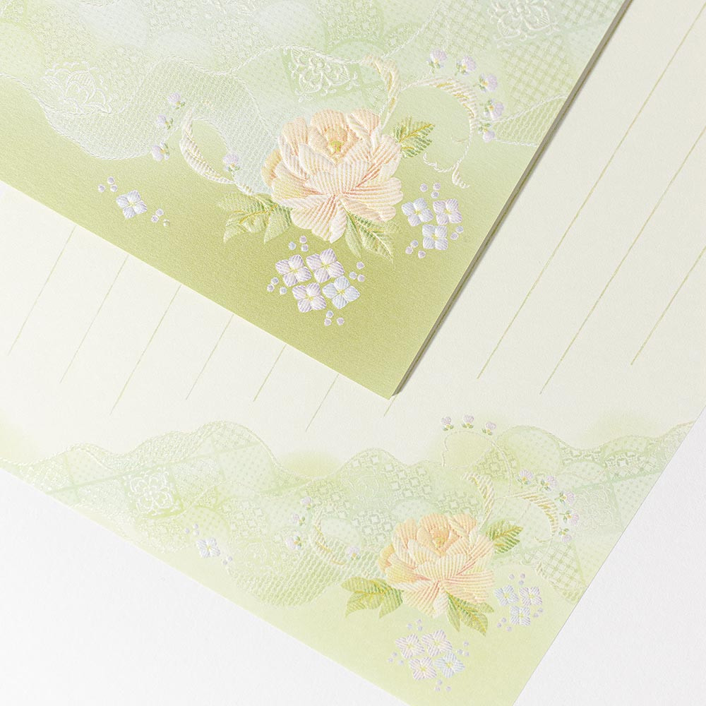やさしく輝くパールシルク印刷と丸みのあるエンボス加工を掛け合わせて刺繍の絵柄を表現した上品な和紙便箋です。