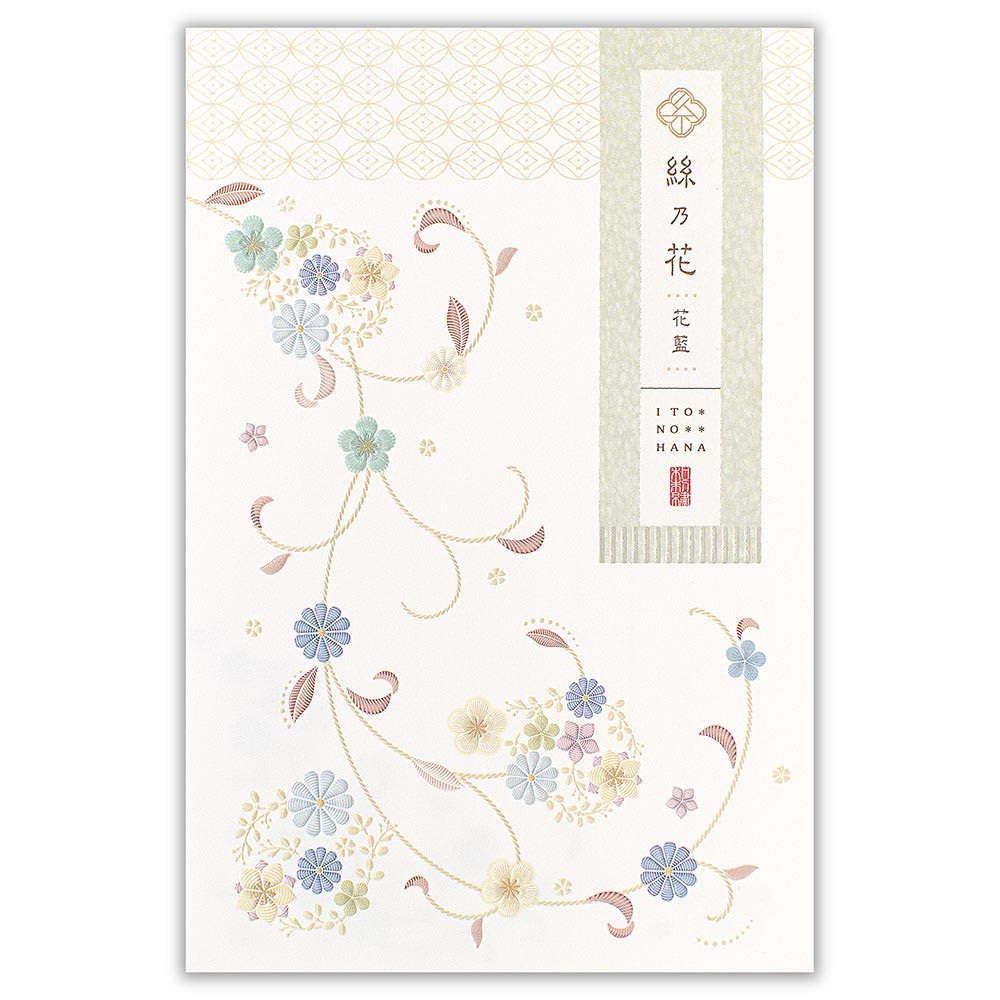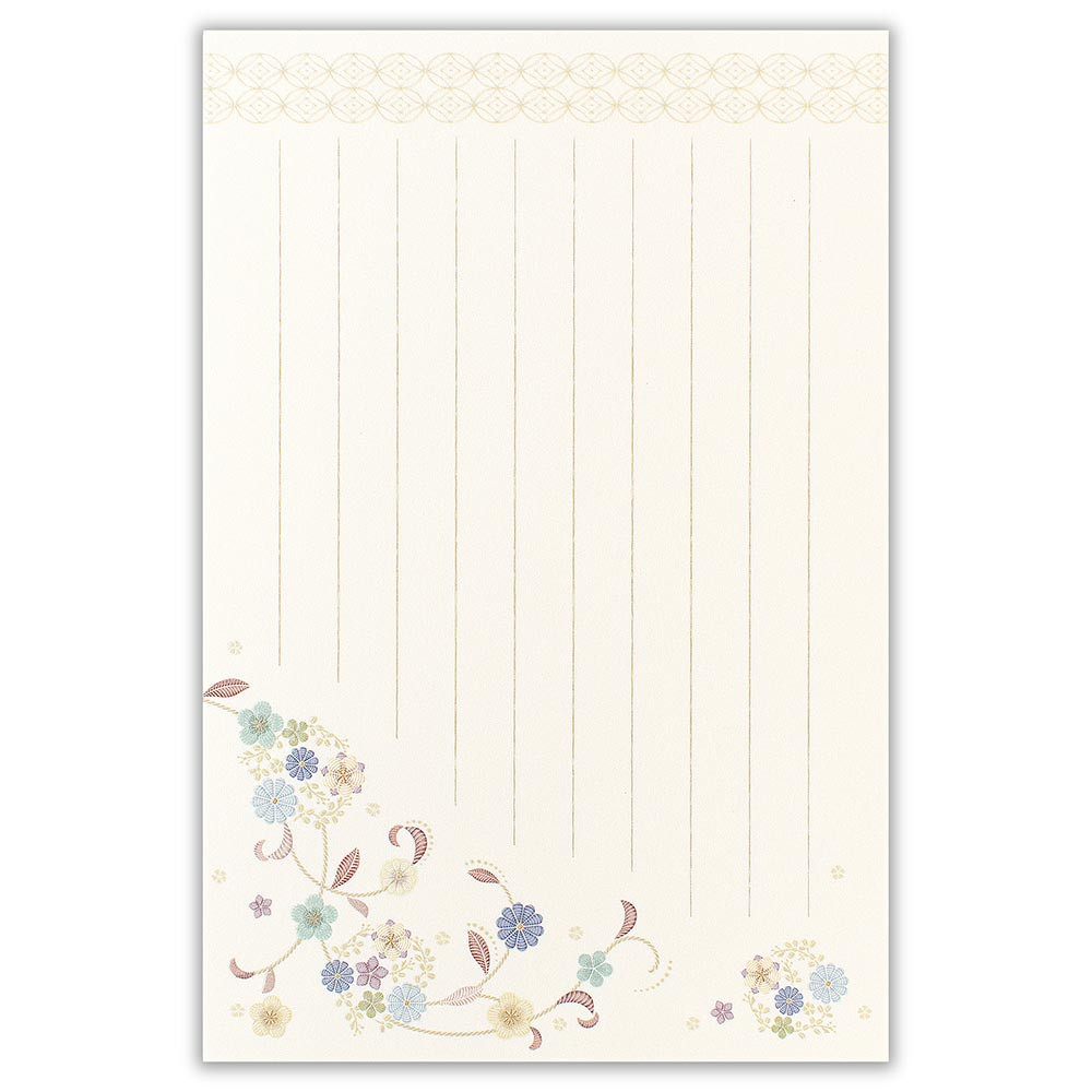 やさしく輝くパールシルク印刷と丸みのあるエンボス加工を掛け合わせ、刺繍の絵柄を表現しました。ブルーの蔓花柄が上品な印象の幅広いシーンでお使いいただける和紙便箋です。