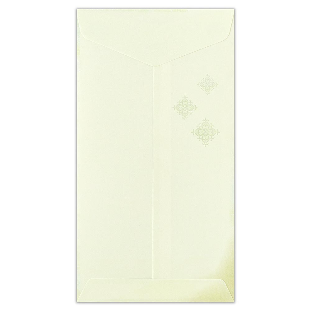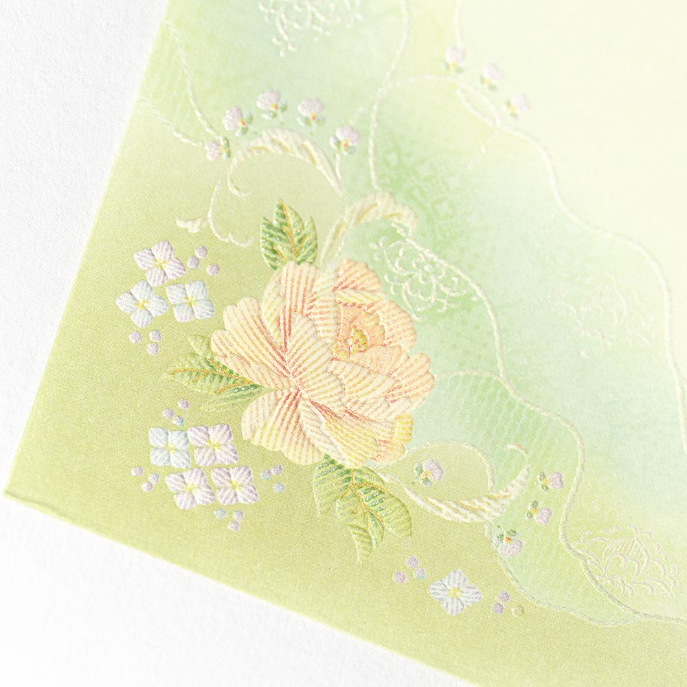 やさしく輝くパールシルク印刷と丸みのあるエンボス加工を掛け合わせて刺繍の絵柄を表現した上品な和紙封筒です。