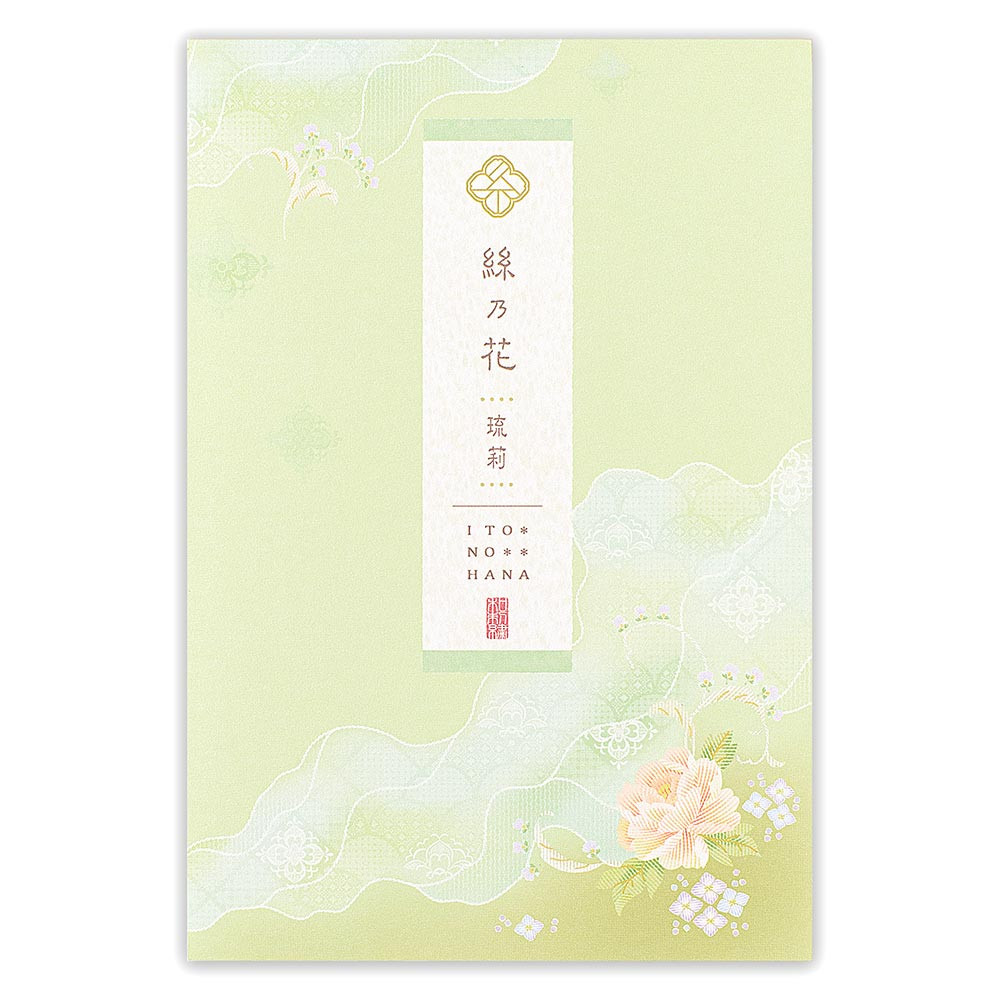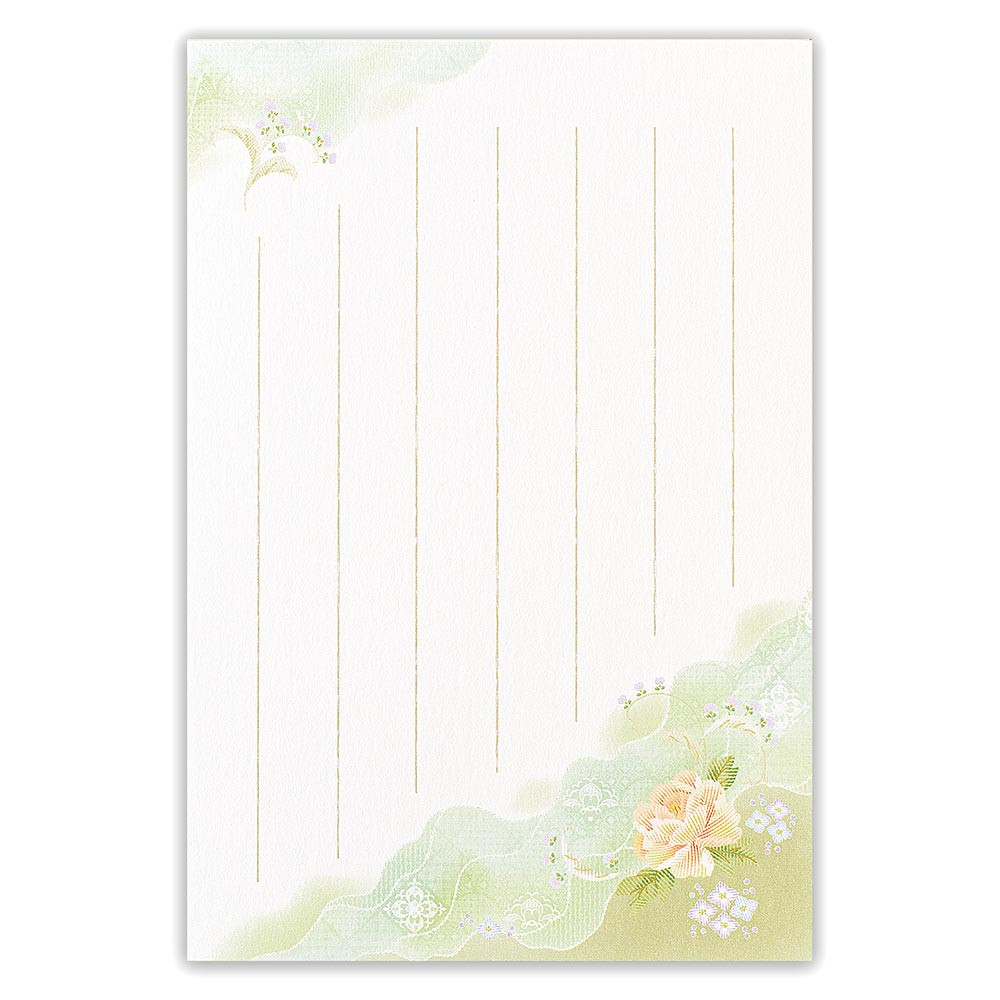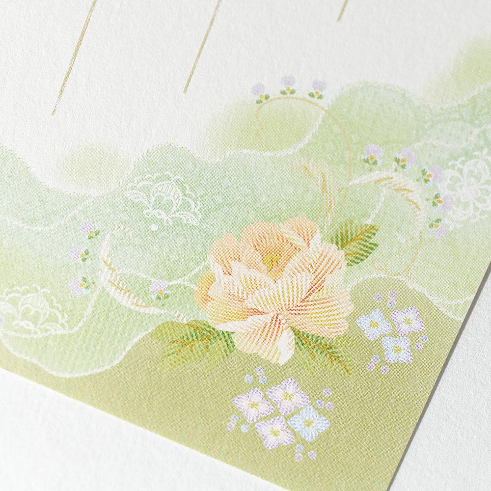 淡い若緑色の霞模様と牡丹の絵柄が爽やかデザインのはがき箋です。
