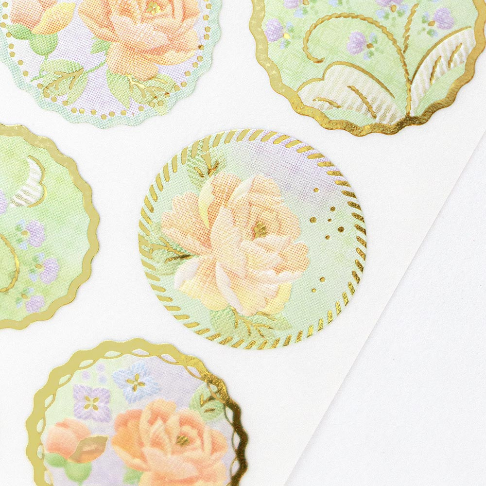 淡い若緑色の霞模様と牡丹の絵柄が華やかな封緘シールです。