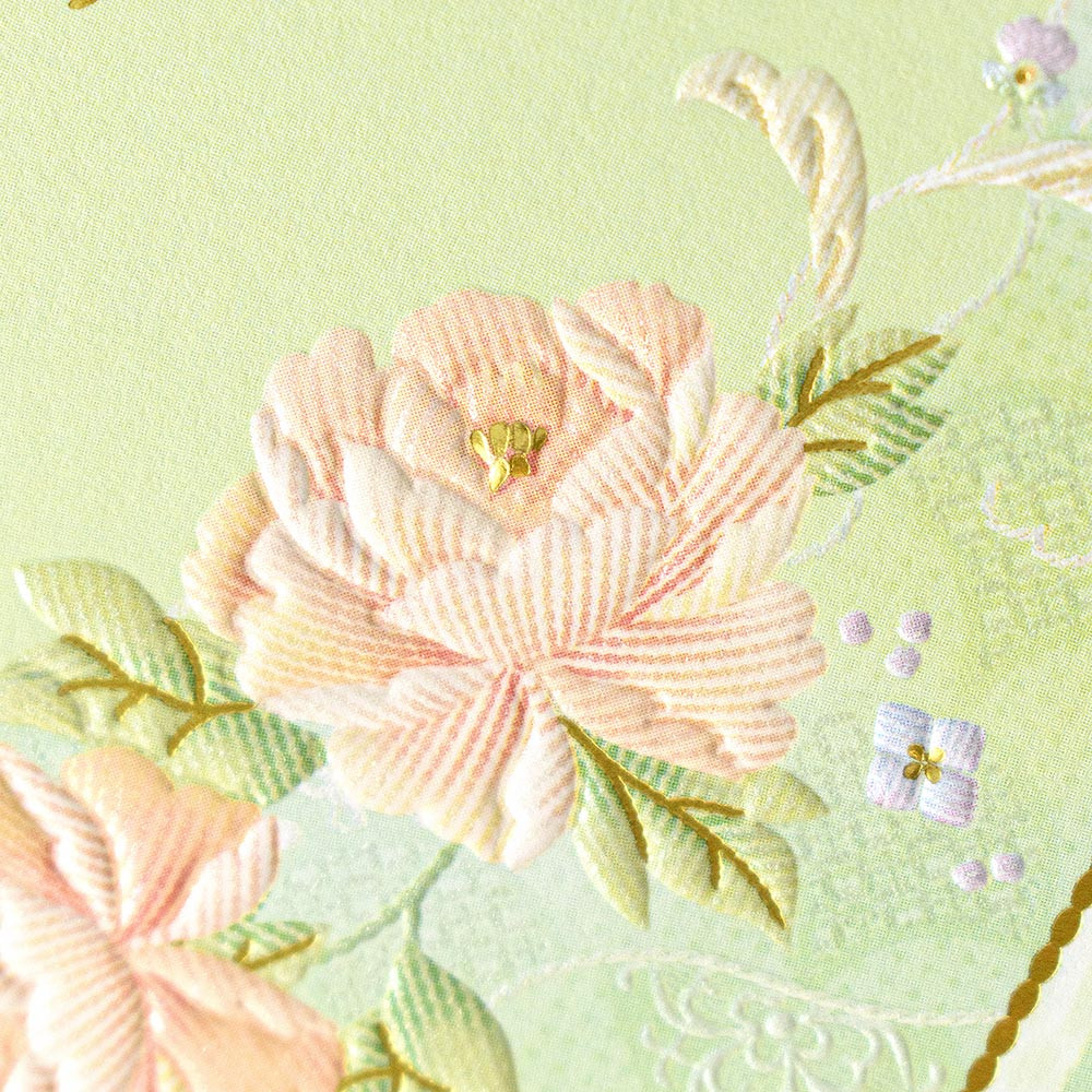 やさしく輝くパールシルク印刷と丸みのあるエンボス加工を掛け合わせて刺繍の絵柄を表現しました。