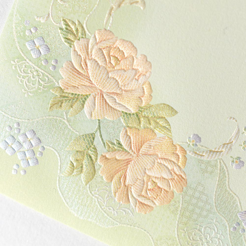 やさしく輝くパールシルク印刷と丸みのあるエンボス加工を掛け合わせて刺繍の絵柄を表現した上品な、のし袋です。
