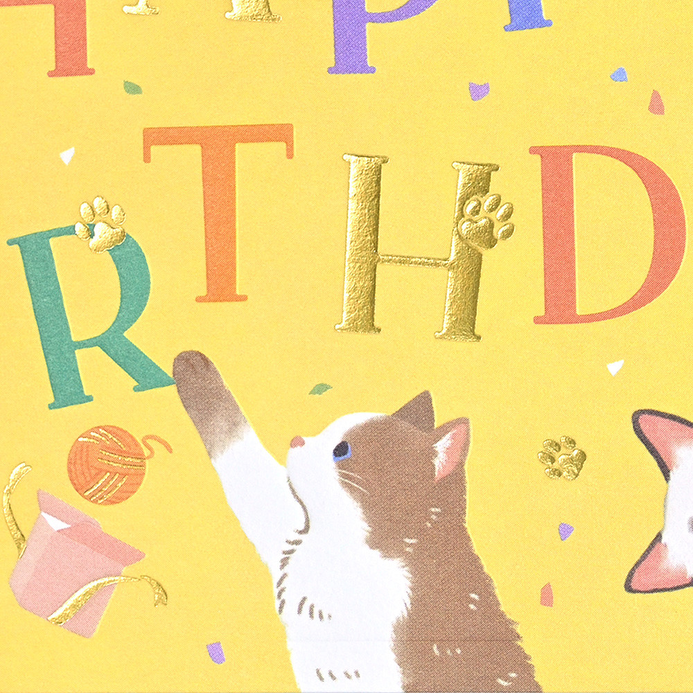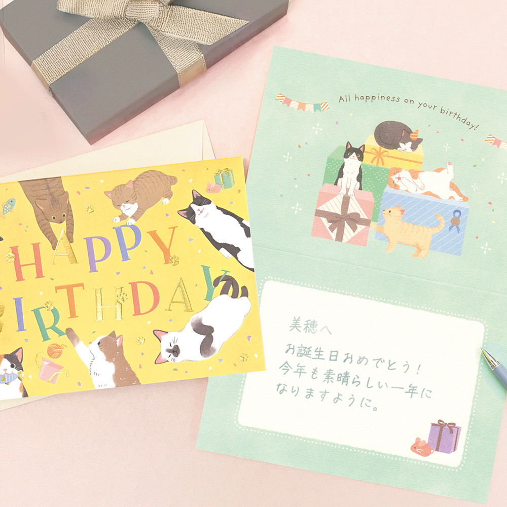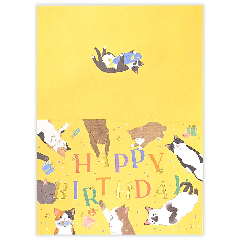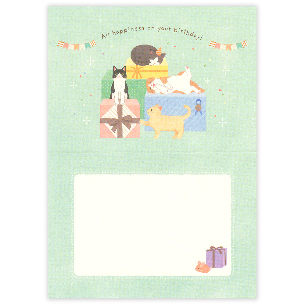 気ままな猫たちがお祝いの気持ちを届けるバースデーカードです。寝たりじゃれたりする自由な姿を可愛らしく描きました。