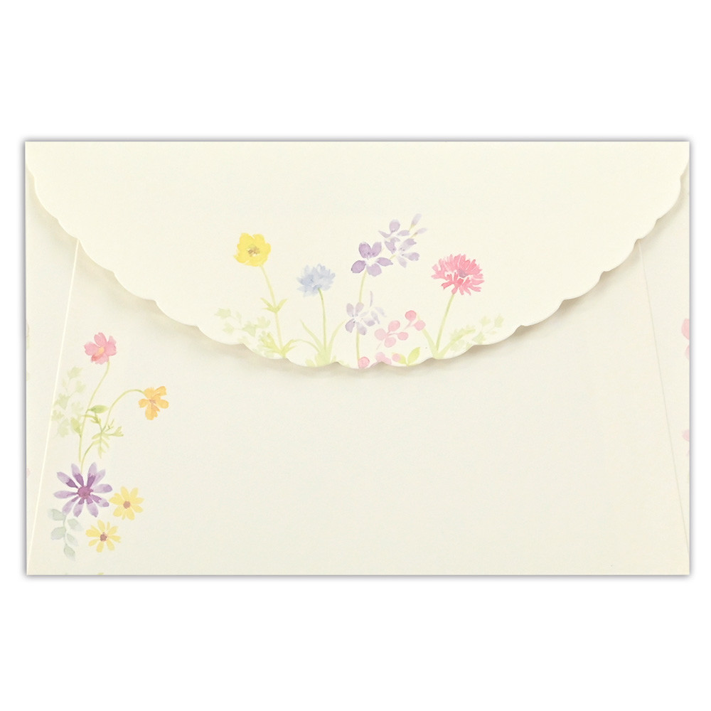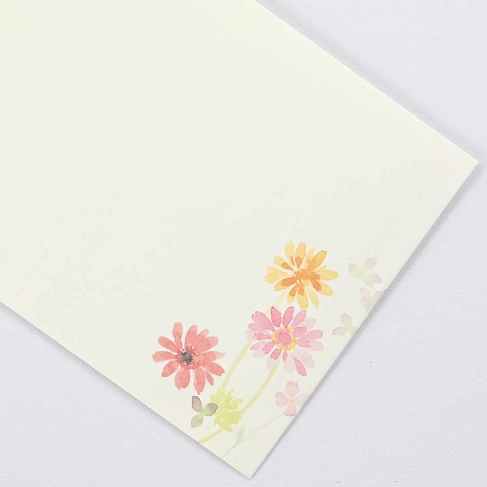 水彩画のような暖かみのある花のイラスト入り封筒です。 水彩で描かれた赤やオレンジの明るい花々が優しく宛名を彩ります。