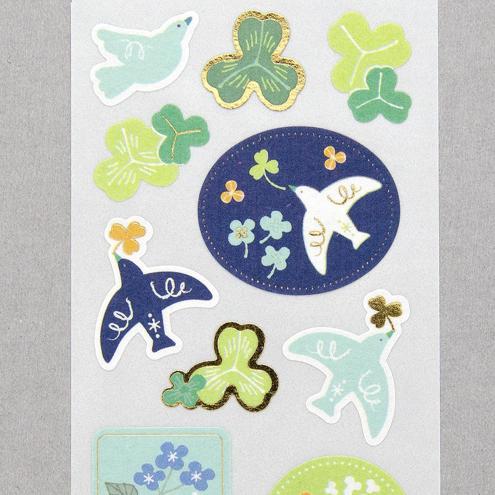 草花の中を、手紙やクローバーをくわえた小鳥が飛ぶ様子を描きました。風合いのある紙に金箔押し加工を施しました。