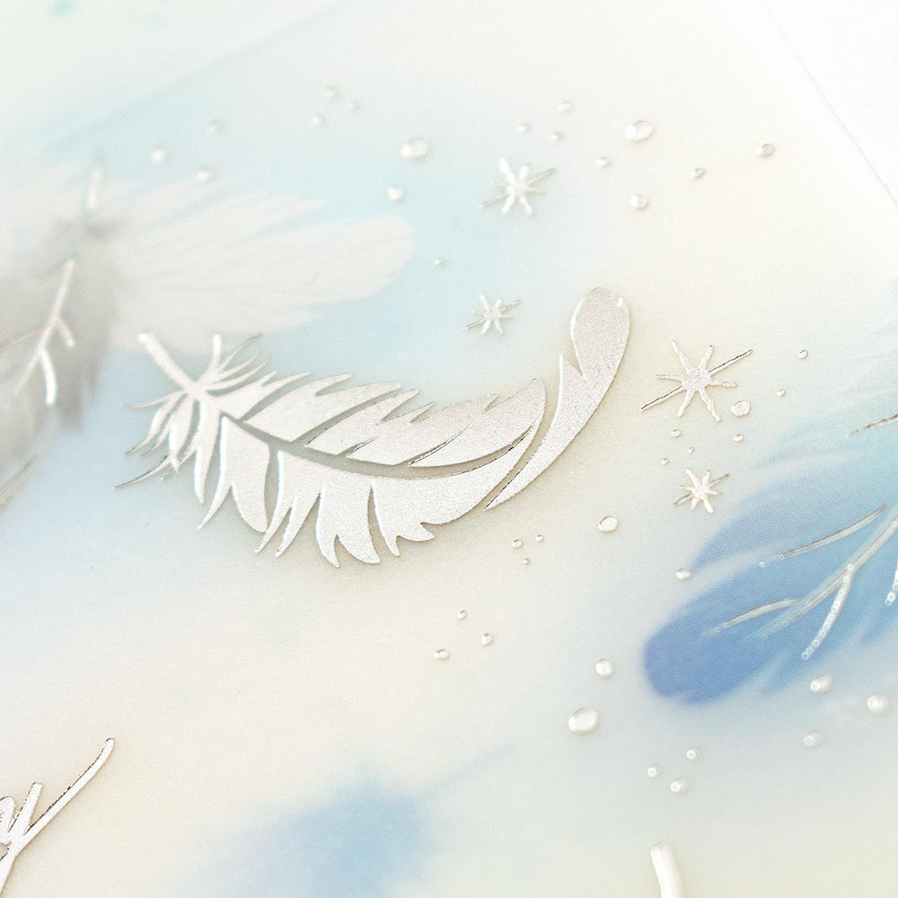 トレーシングペーパーを使用した淡く優しく透けるお誕生日カードです。 カードが2枚重なることで出来上がるデザインです。 ブルーをベースとした羽を描きました。