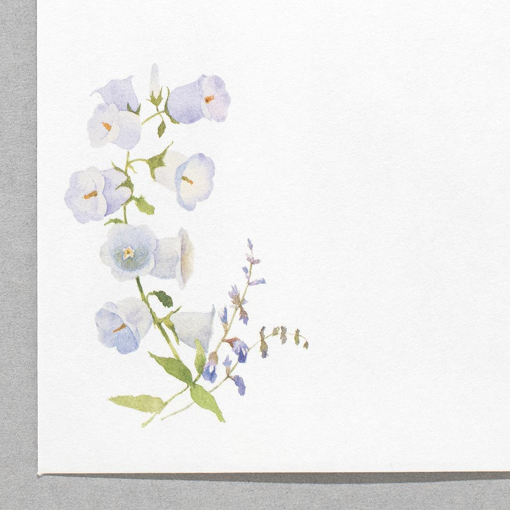 ラークスパー、ブルースター、カンパニュラ、セージー描かれています。